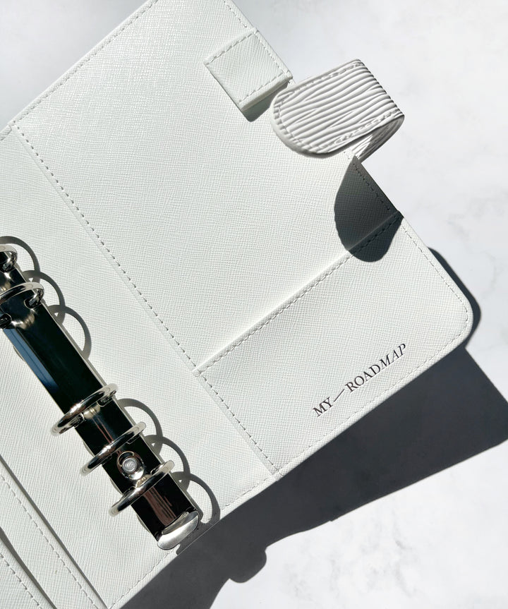 This personal-sized binder will impress you with its refreshing and exclusive design. The pleasant surface texture of the vegan leather in the color "Ivory" gives it a distinctive elegance.