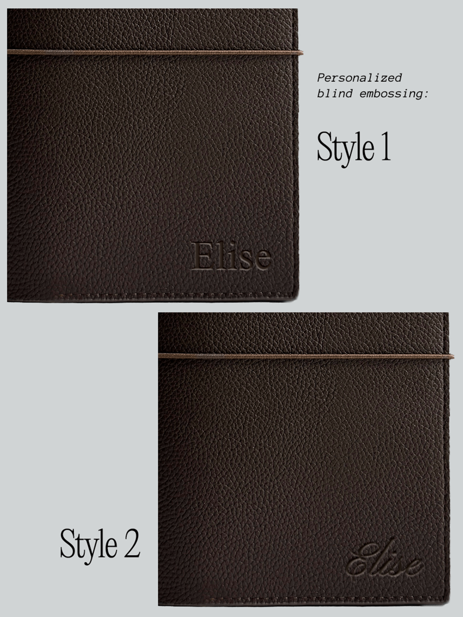 • Blind embossing: 2 font options available; standard placement on the lower right front side (see photo gallery), up to 8 characters. Other placements available upon request