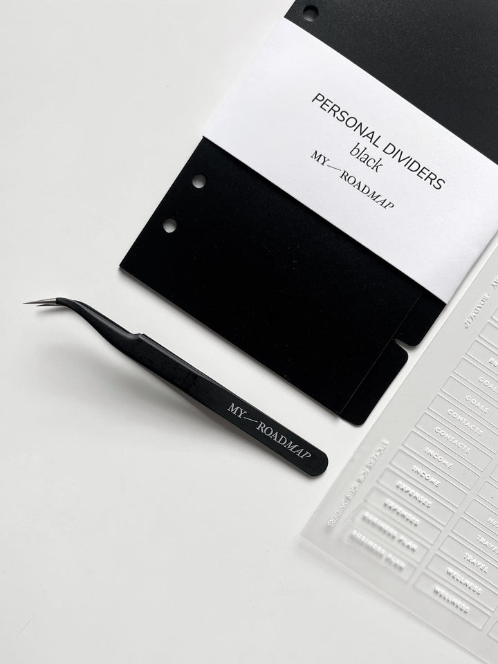 Register A5/Personal schwarz+Tab-Stickers transparent (weiß Druck)+Pinzette