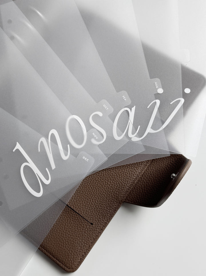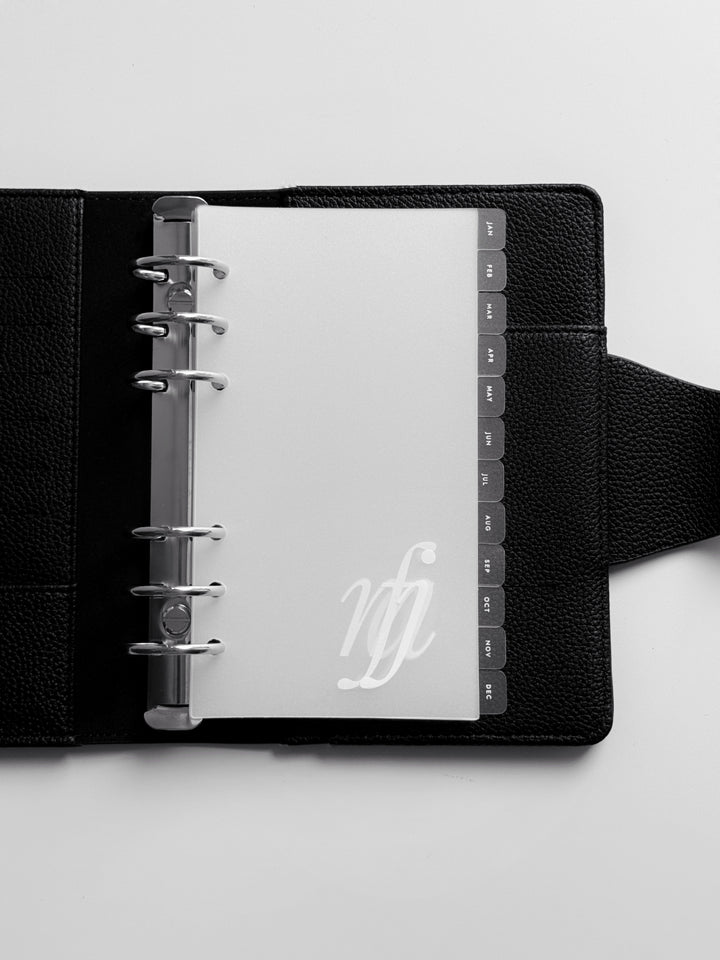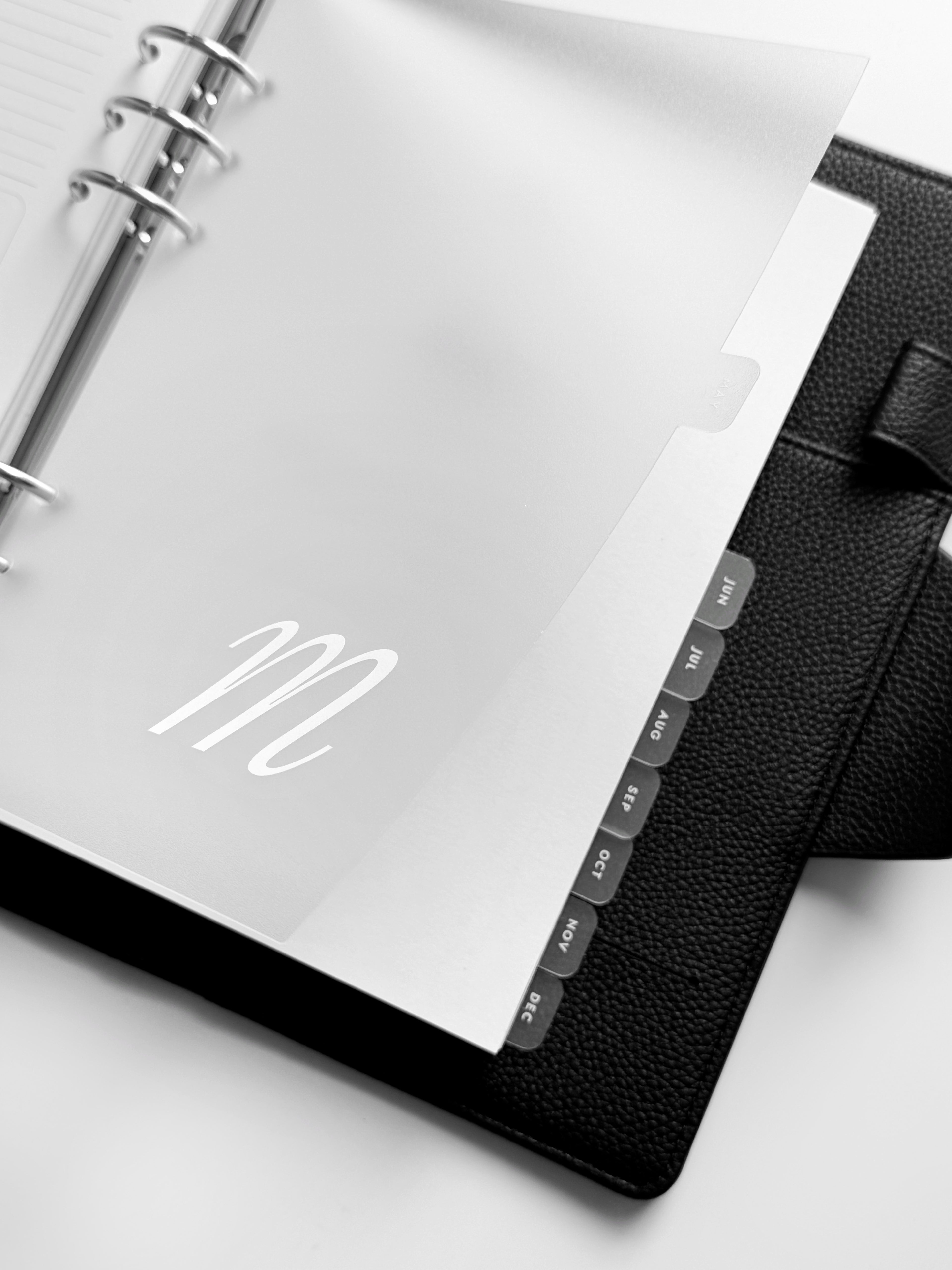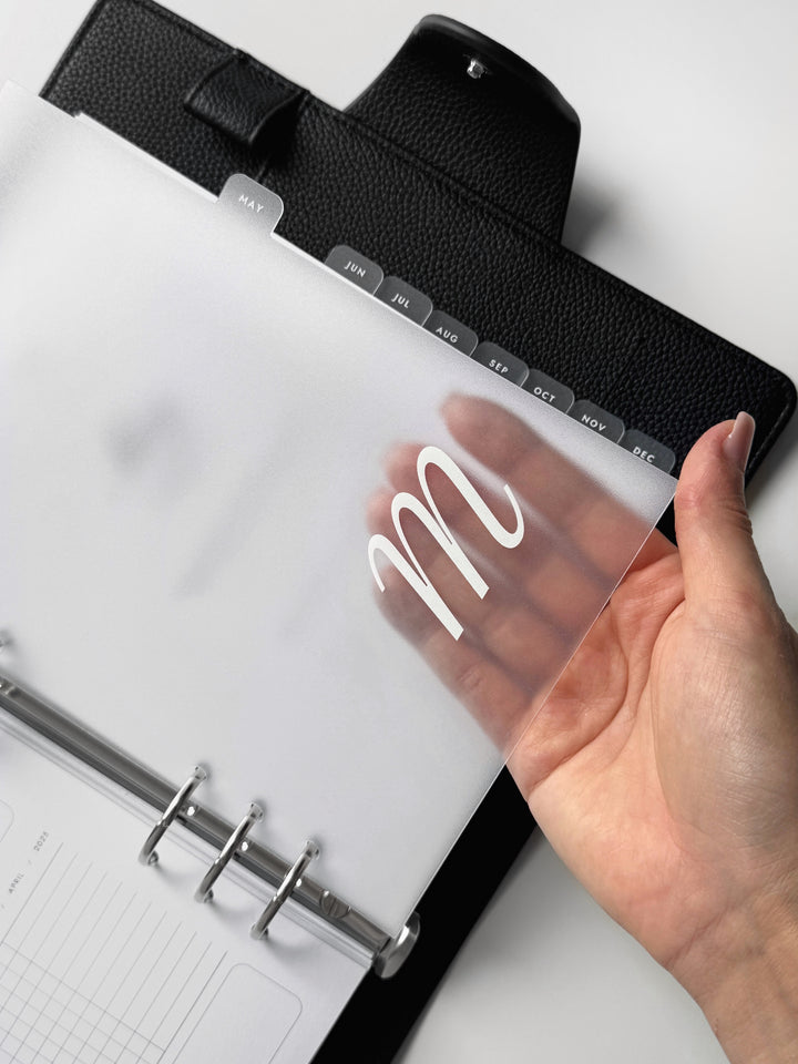 Diese frosted Trennblätter in A5- oder Personal-Größe vereinen die Funktion von klassischen Trennblättern mit der Ästhetik von Dashboard-Einlagen. Jedes Blatt ist mit einem stilvollen weißen Buchstaben des Monats versehen und bringt so minimalistische und zugleich elegante Ordnung in deinen Planer.