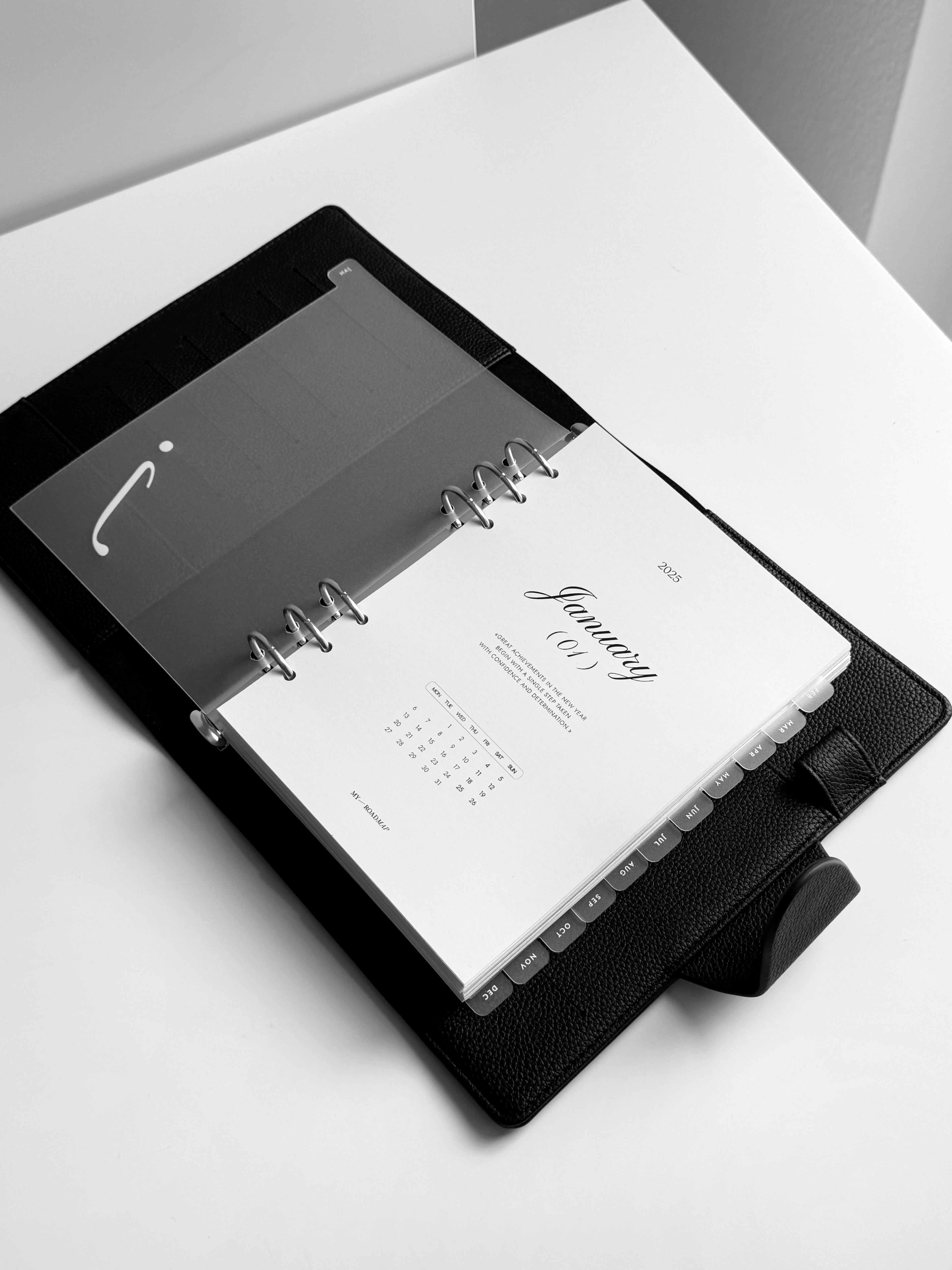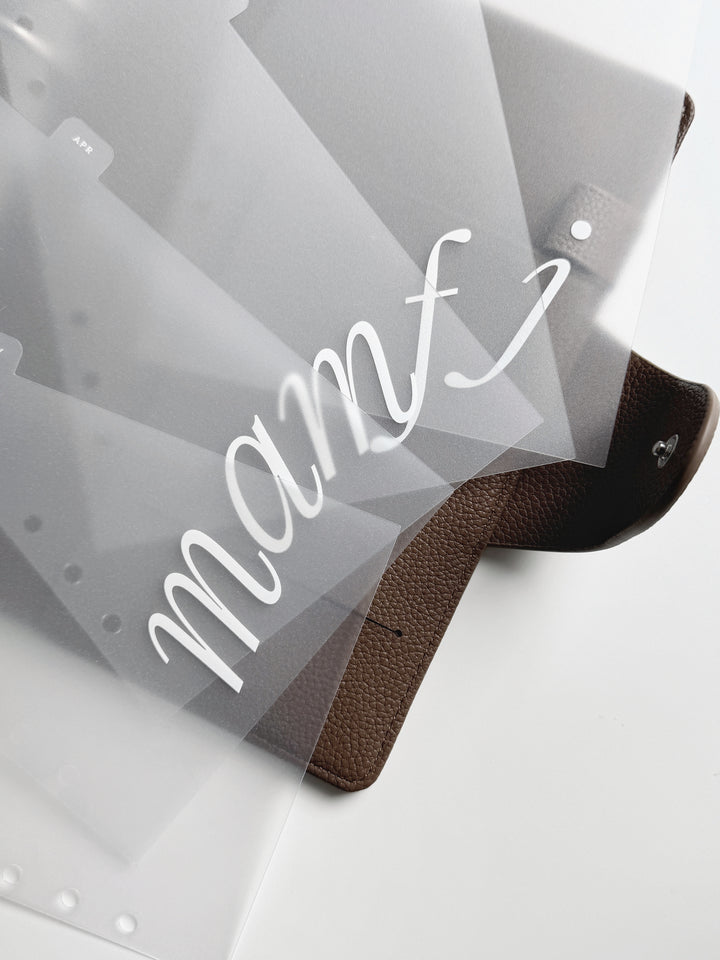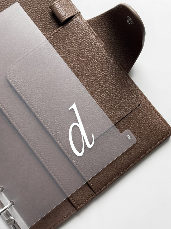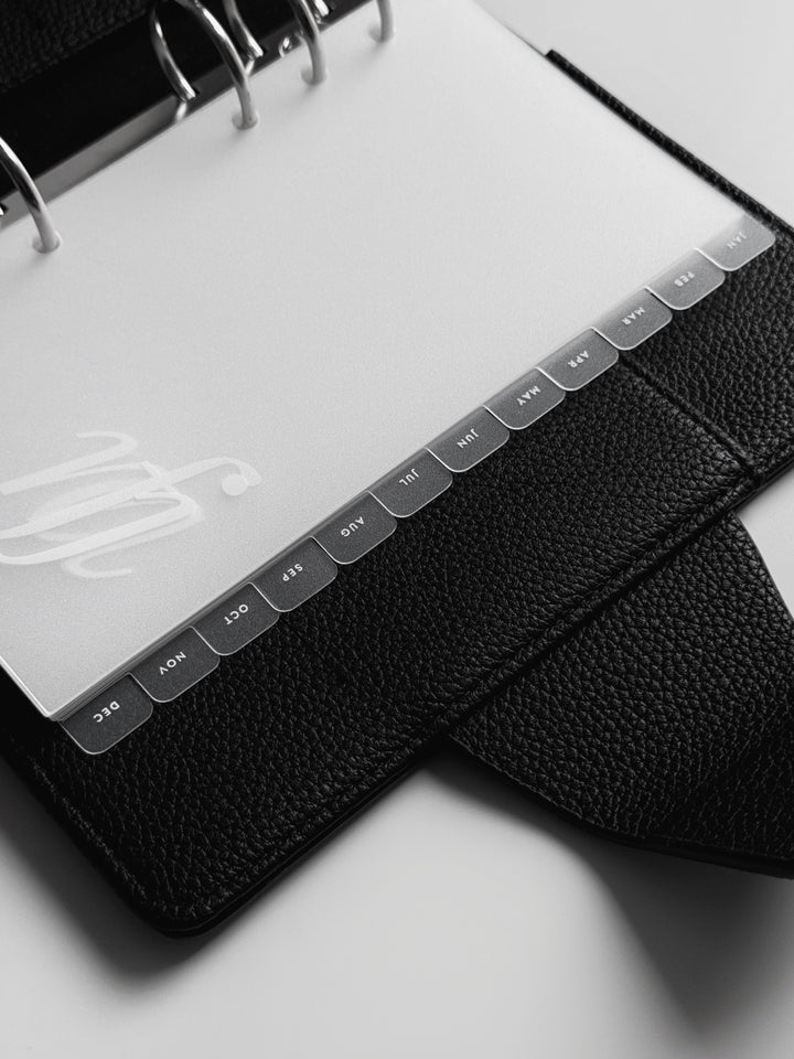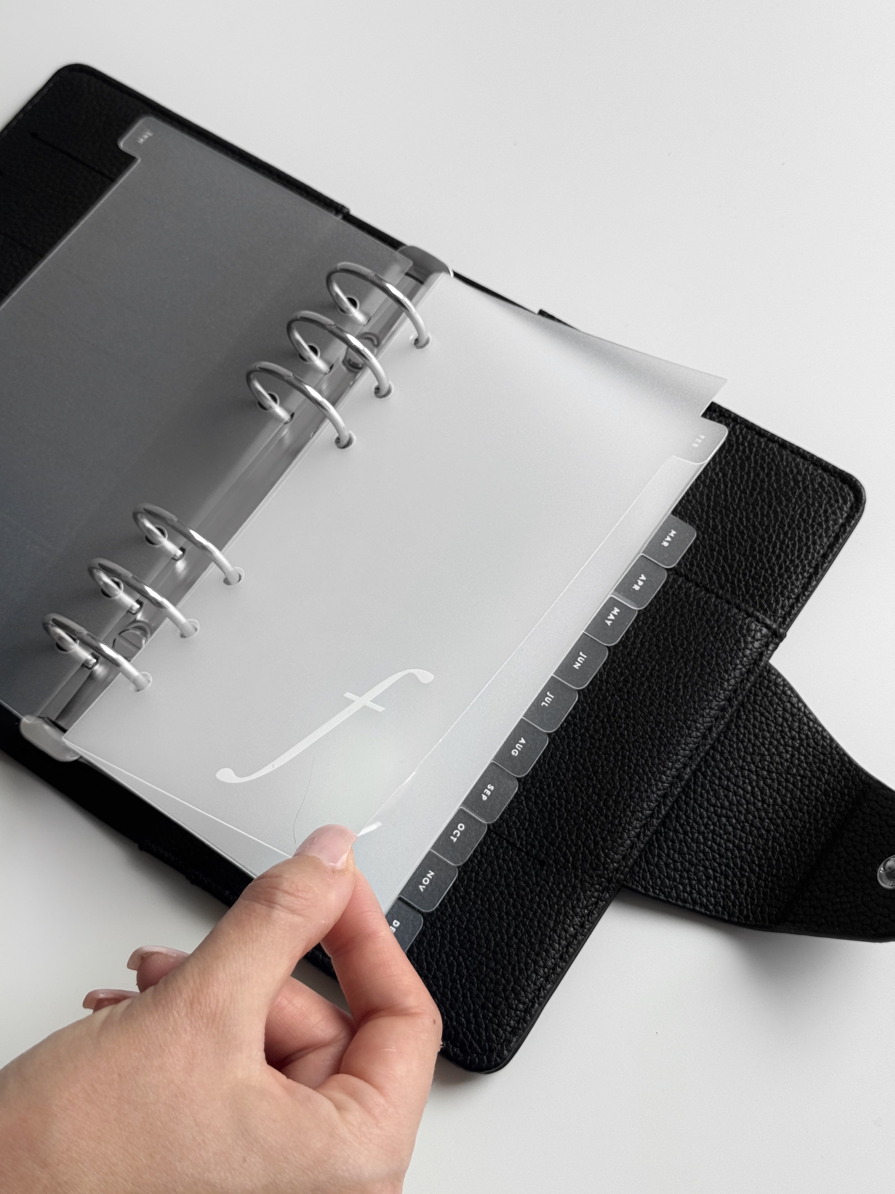 Diese frosted Trennblätter in A5- oder Personal-Größe vereinen die Funktion von klassischen Trennblättern mit der Ästhetik von Dashboard-Einlagen. Jedes Blatt ist mit einem stilvollen weißen Buchstaben des Monats versehen und bringt so minimalistische und zugleich elegante Ordnung in deinen Planer.