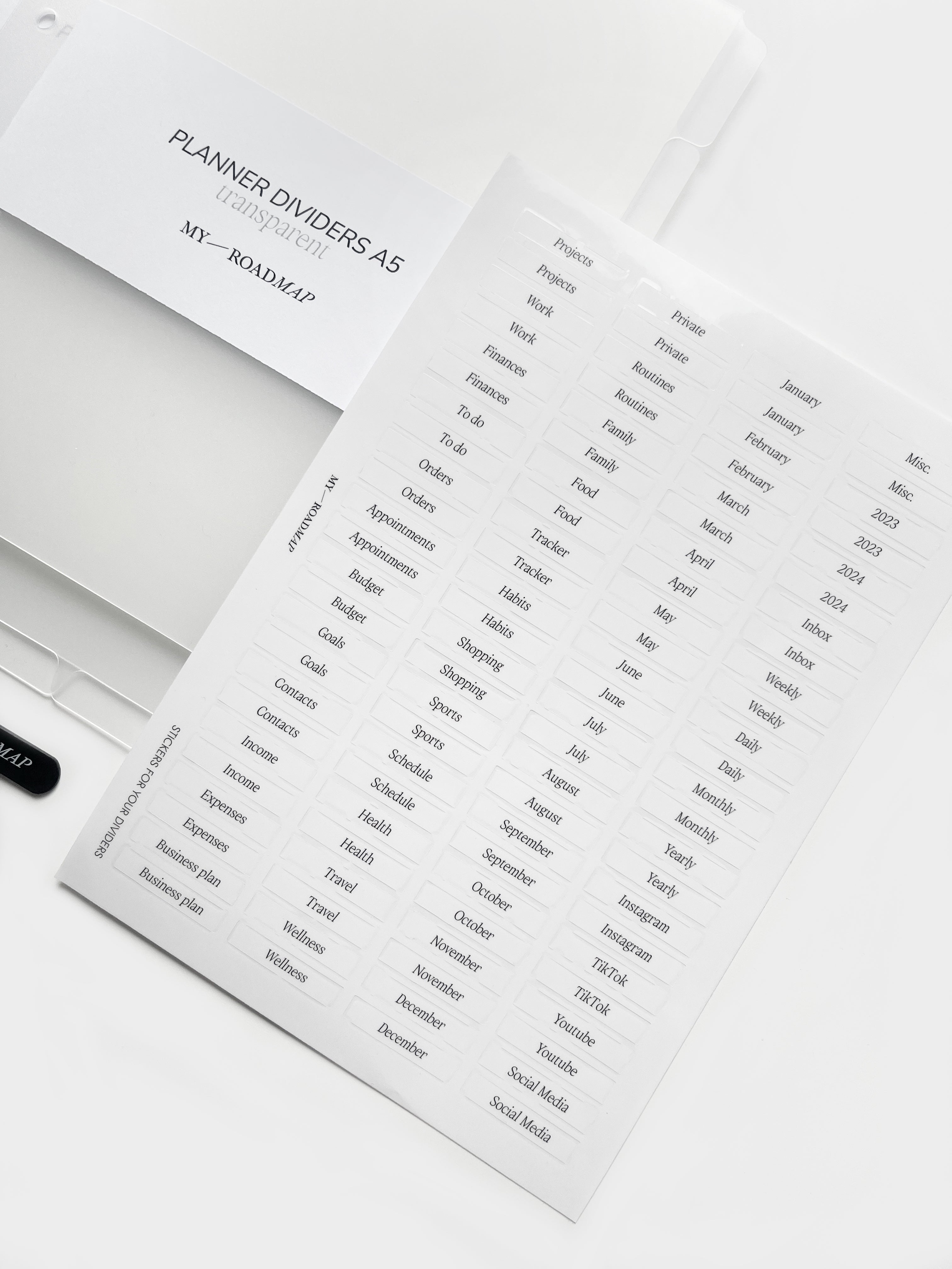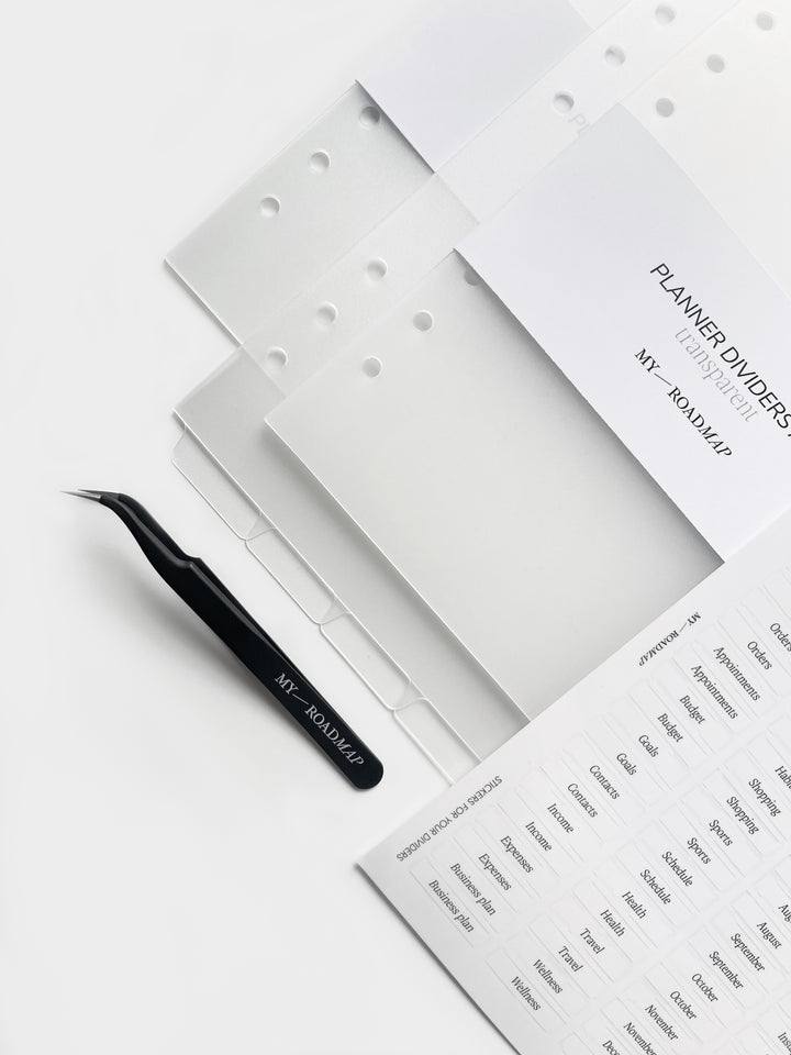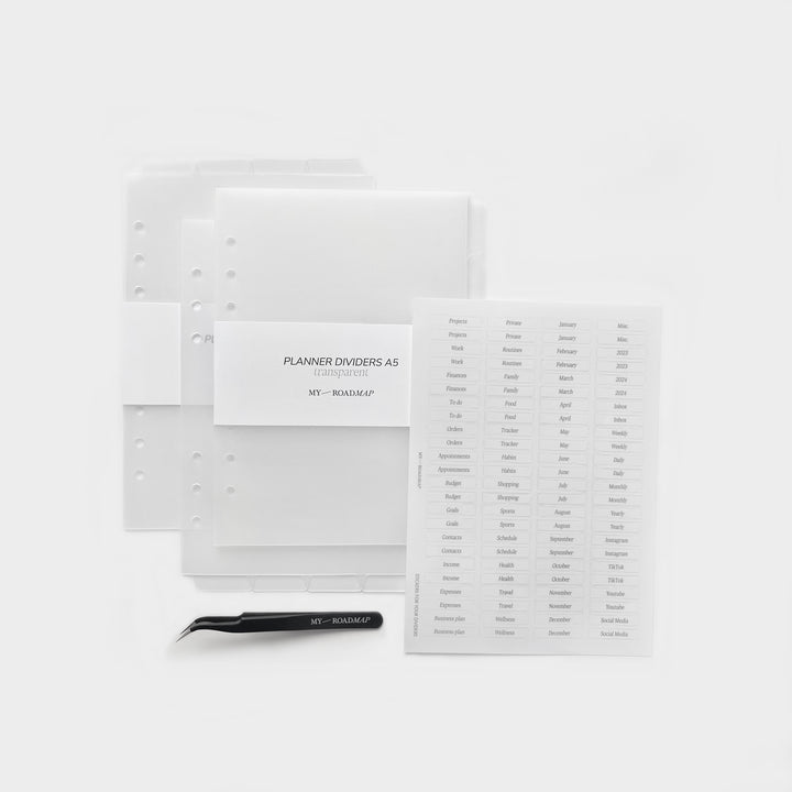 3 Register frosted A5+Stickers transparent (schwarz Druck)+Pinzette
