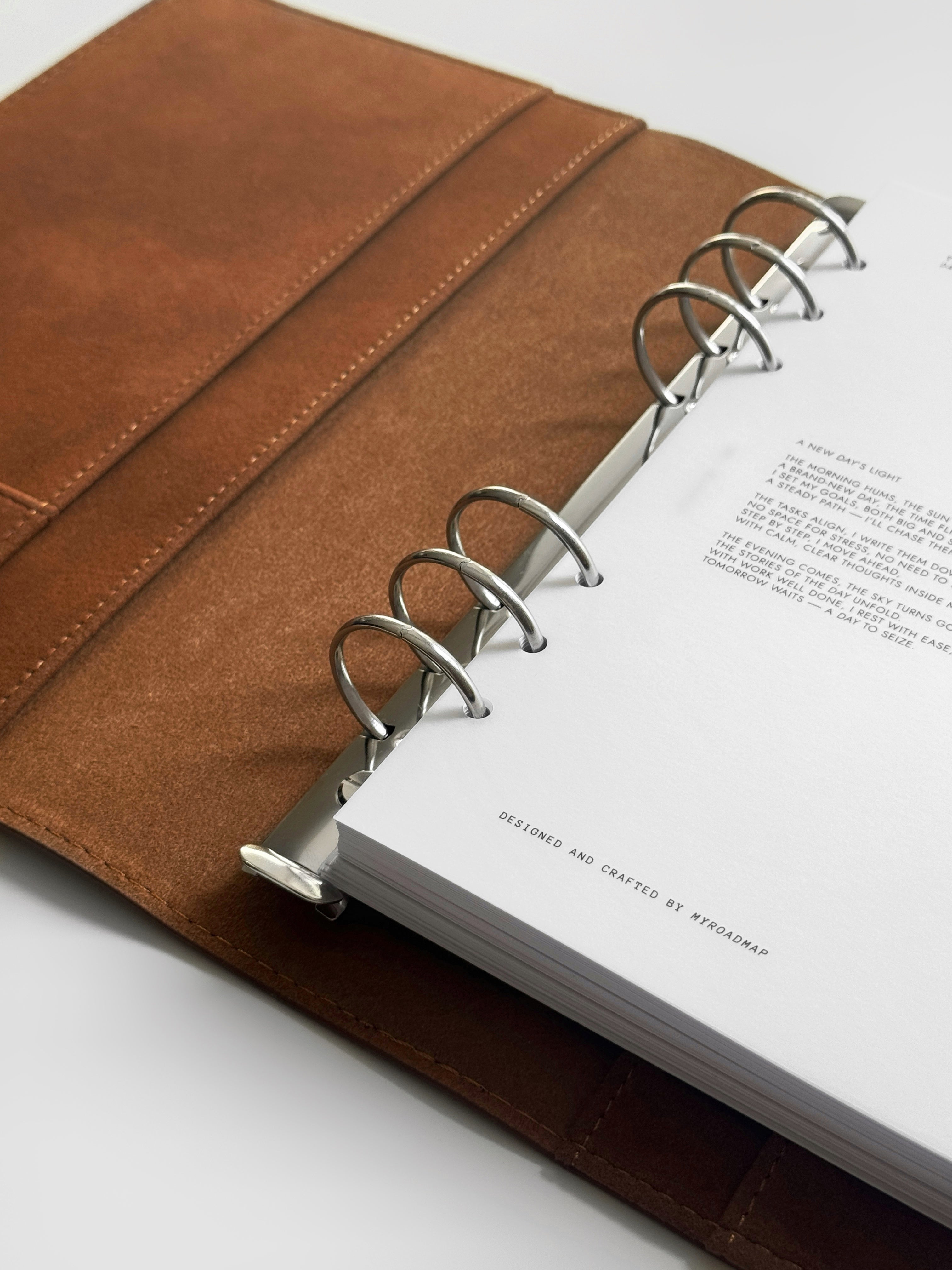 Unsere zweite Variante bietet die Wahl zwischen schwarzen oder silbernen Ringen und verwandelt das Cover in einen hochfunktionalen A5-Ringplaner. Diese Option ist ideal für alle, die Wert auf strukturierte Planung und Organisation legen, ohne auf ein stilvolles Erscheinungsbild zu verzichten.