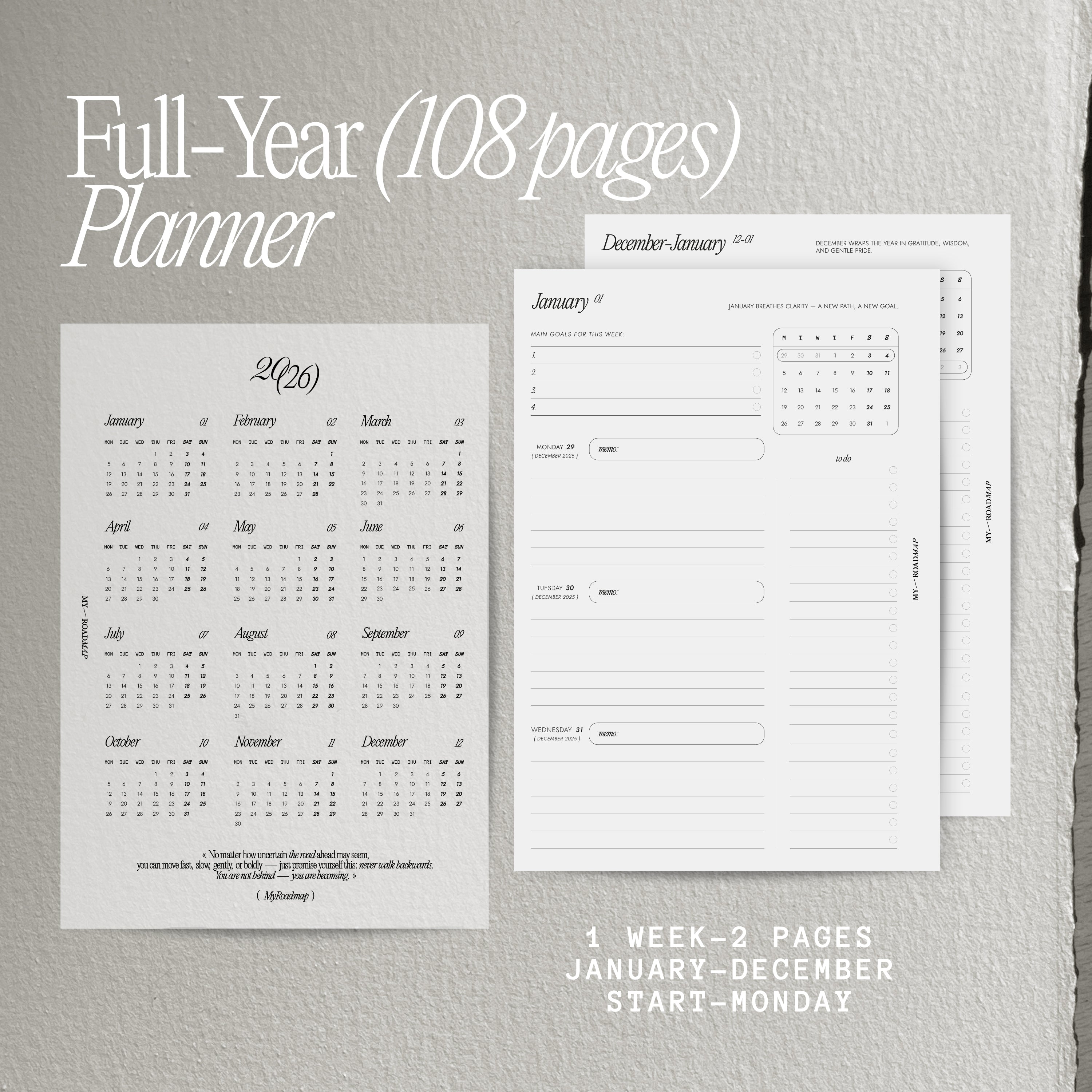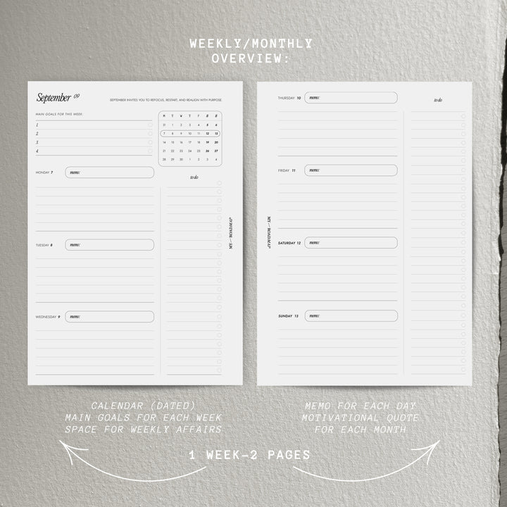 Diese Kalendereinlagen sind für das gesamte Jahr 2026 konzipiert und bietet ausreichend Platz für das Notieren von Zielen, Aufgaben und Plänen für jeden Tag. Jede Woche wird auf zwei Seiten dargestellt, was es einfach macht, alle Aufgaben und Ereignisse der Woche im Überblick zu behalten. Am Anfang jeder Woche gibt es Platz, um vier Hauptziele aufzuschreiben, was hilft, sich auf die Prioritäten zu konzentrieren. Zusätzliche Abschnitte bieten viel Platz für wöchentliche To Do`s. Des weiteren gibt es eine kleine Kalenderübersicht, um wichtige Termine und Ereignisse nicht zu vergessen. Diese Kalendereinlagen werden zu einem unverzichtbaren Werkzeug für produktive Planung und Zielerreichung im Jahr 2026.