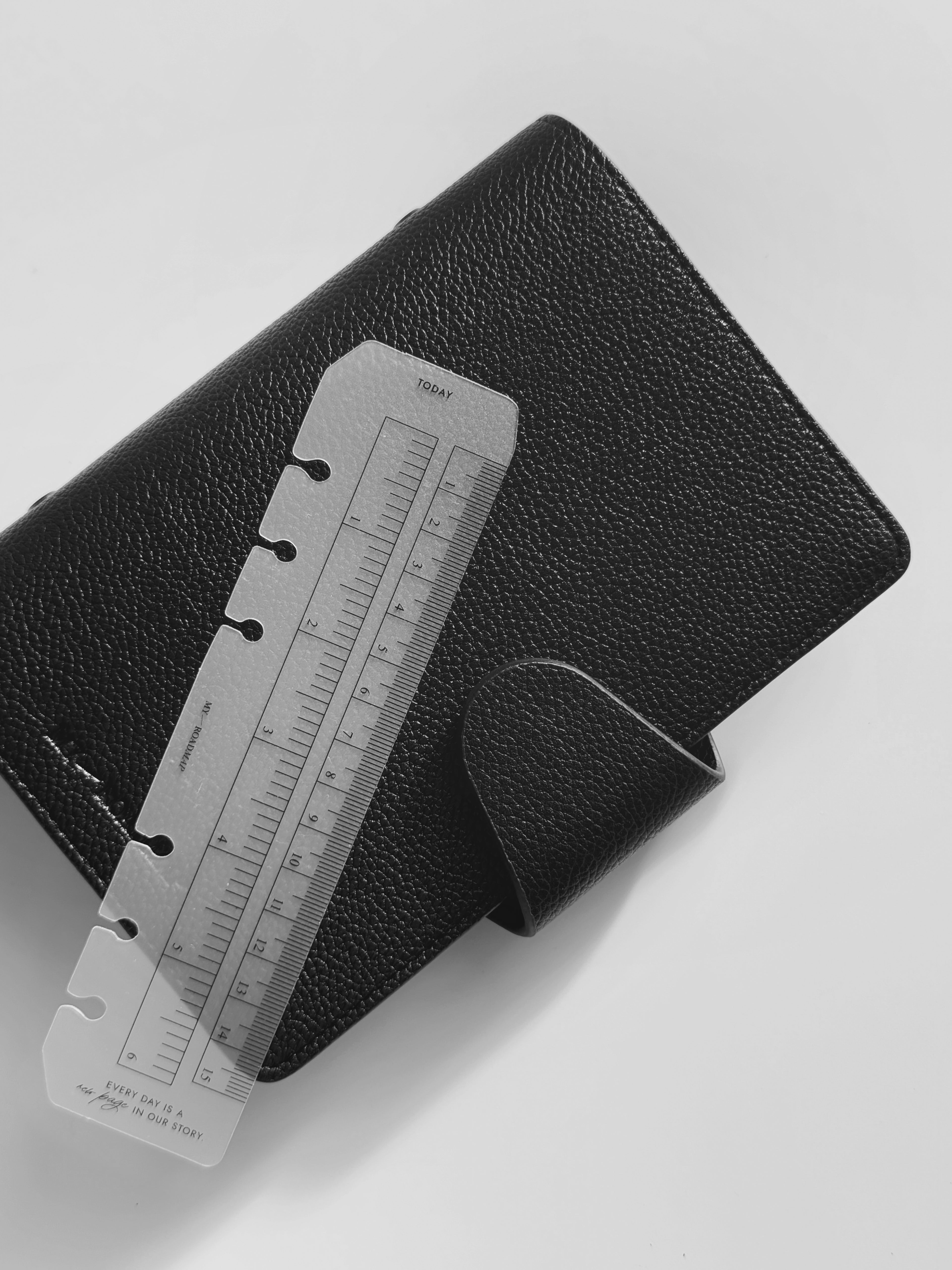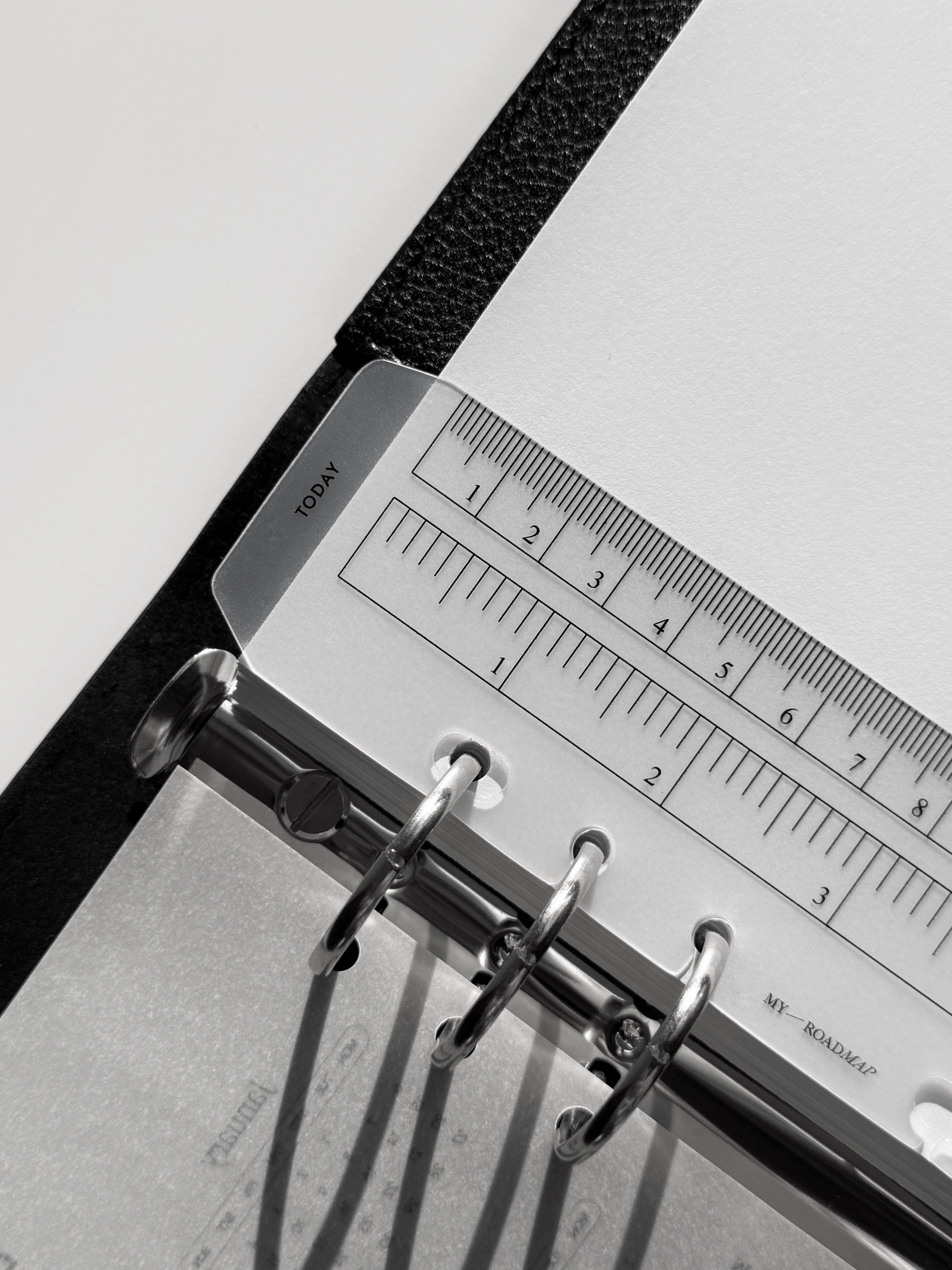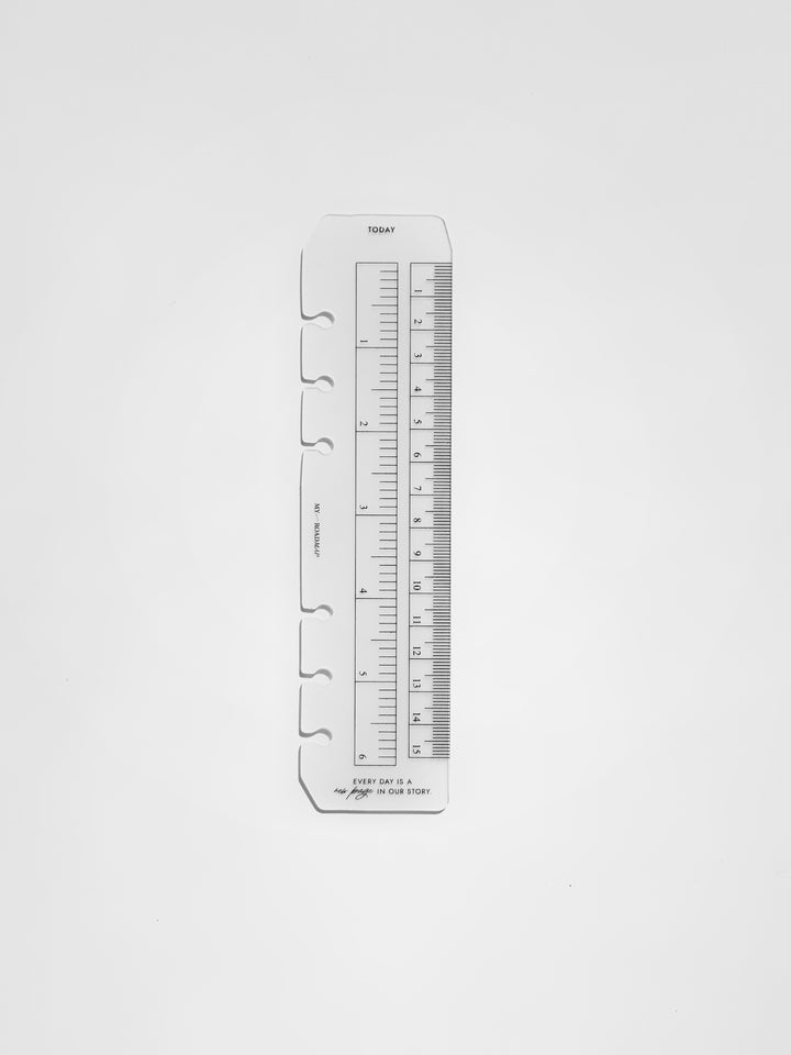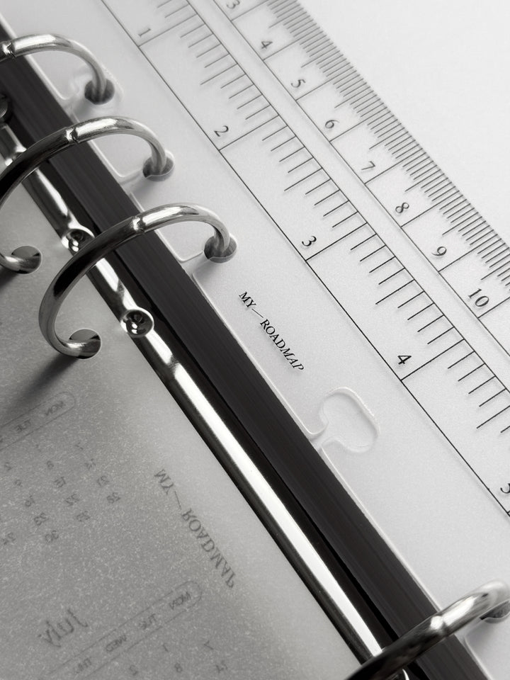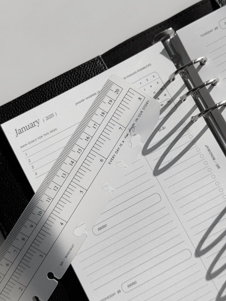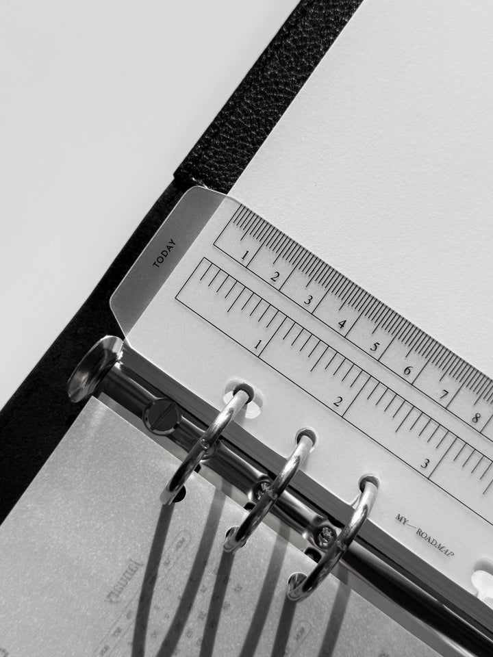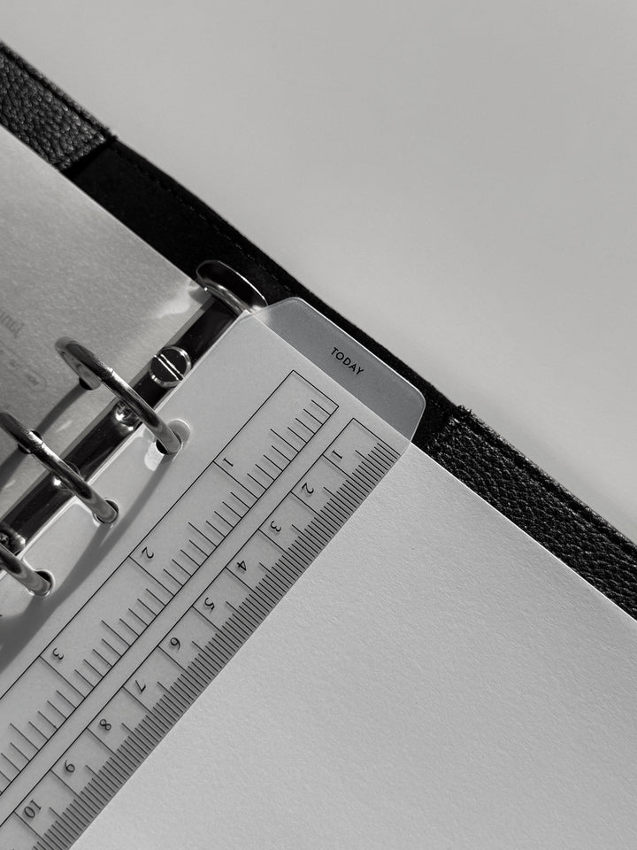 Dieses transparente Lesezeichen aus robustem Kunststoff ist perfekt für Organizer mit Ringmechanismus geeignet. Es erfüllt eine doppelte Funktion: Es dient als Messinstrument mit klaren Skalierungen in Zentimetern und Zoll und kann gleichzeitig als Lesezeichen mit der Markierung «Today» (Heute) verwendet werden, um schnell das aktuelle Datum oder wichtige Einträge zu finden. Das Lesezeichen lässt sich dank spezieller offener Löcher einfach ein- und ausheften, ohne die Ringe zu öffnen. Das elegante, minimalistische Design und die kompakte Größe machen es zu einem stilvollen und praktischen Accessoire, das perfekt zu Formaten wie A5 und Personal passt.