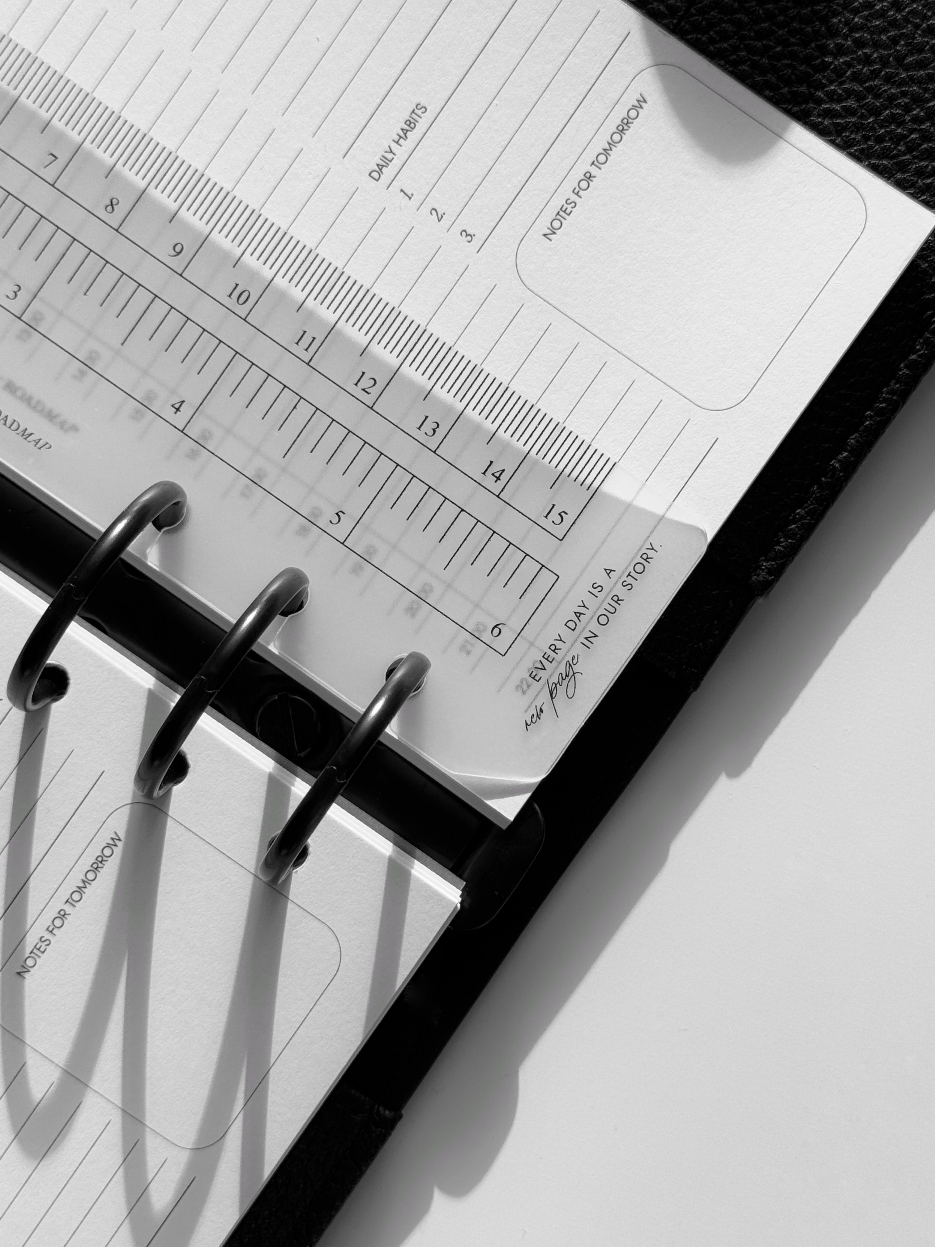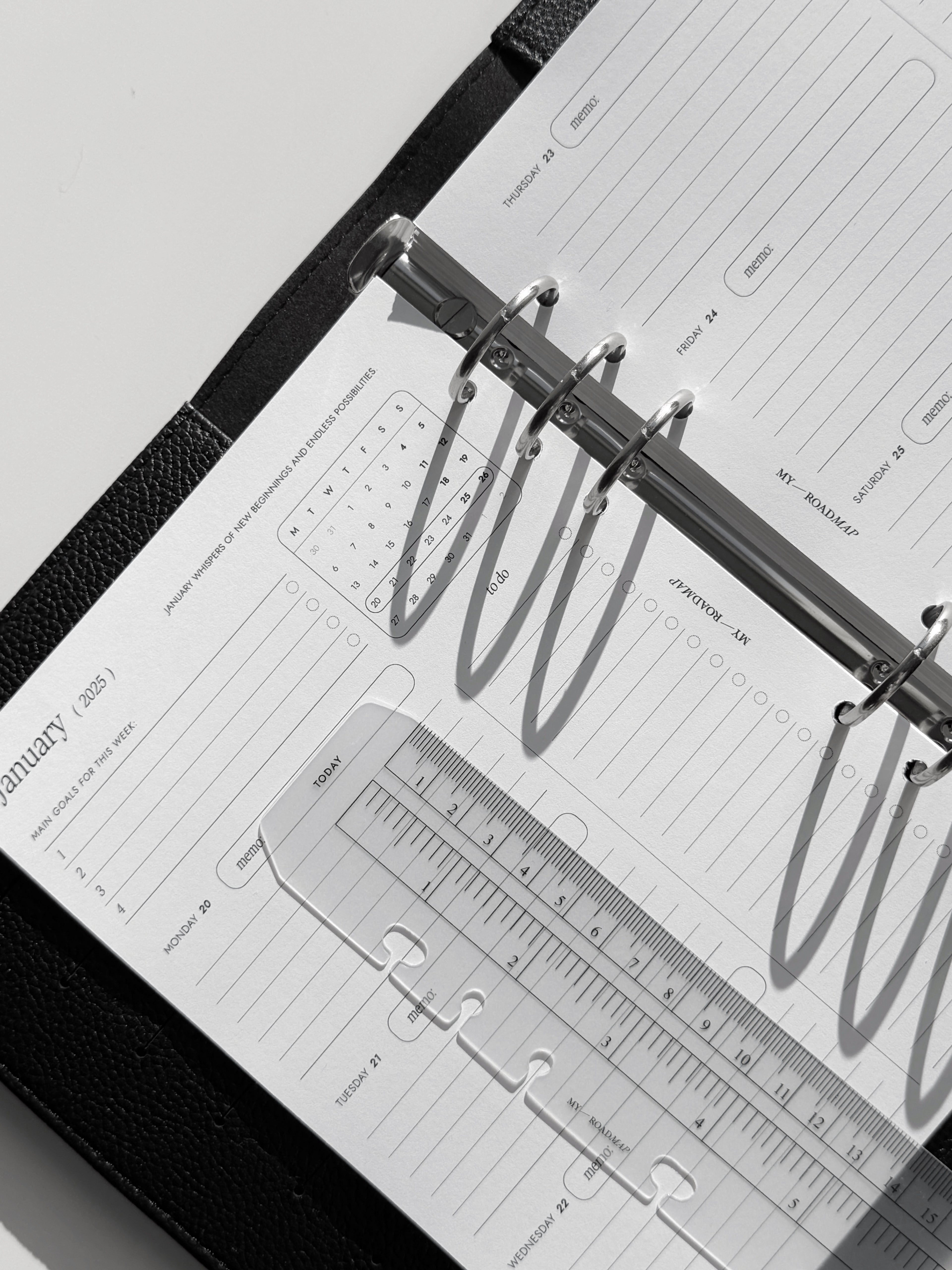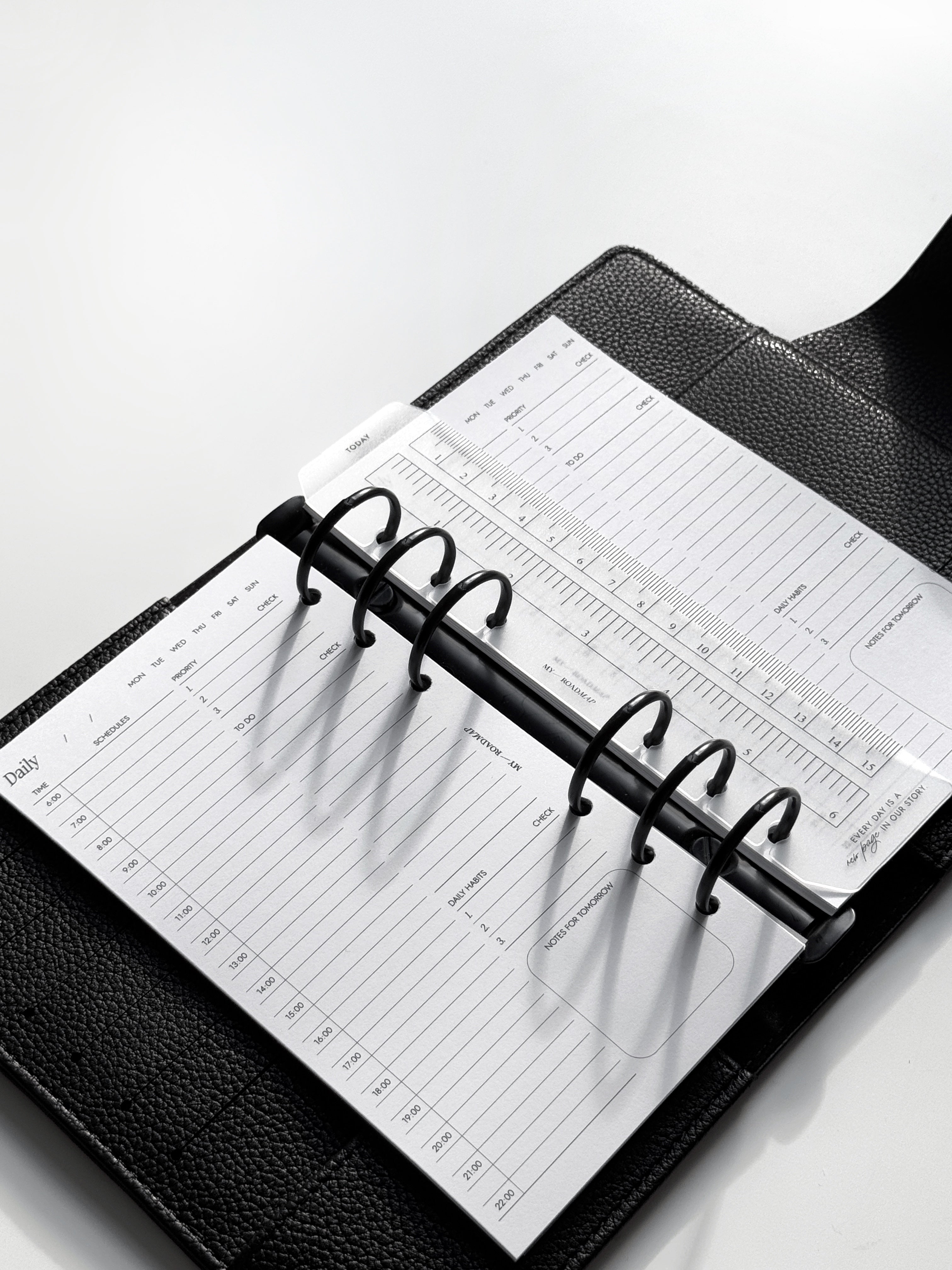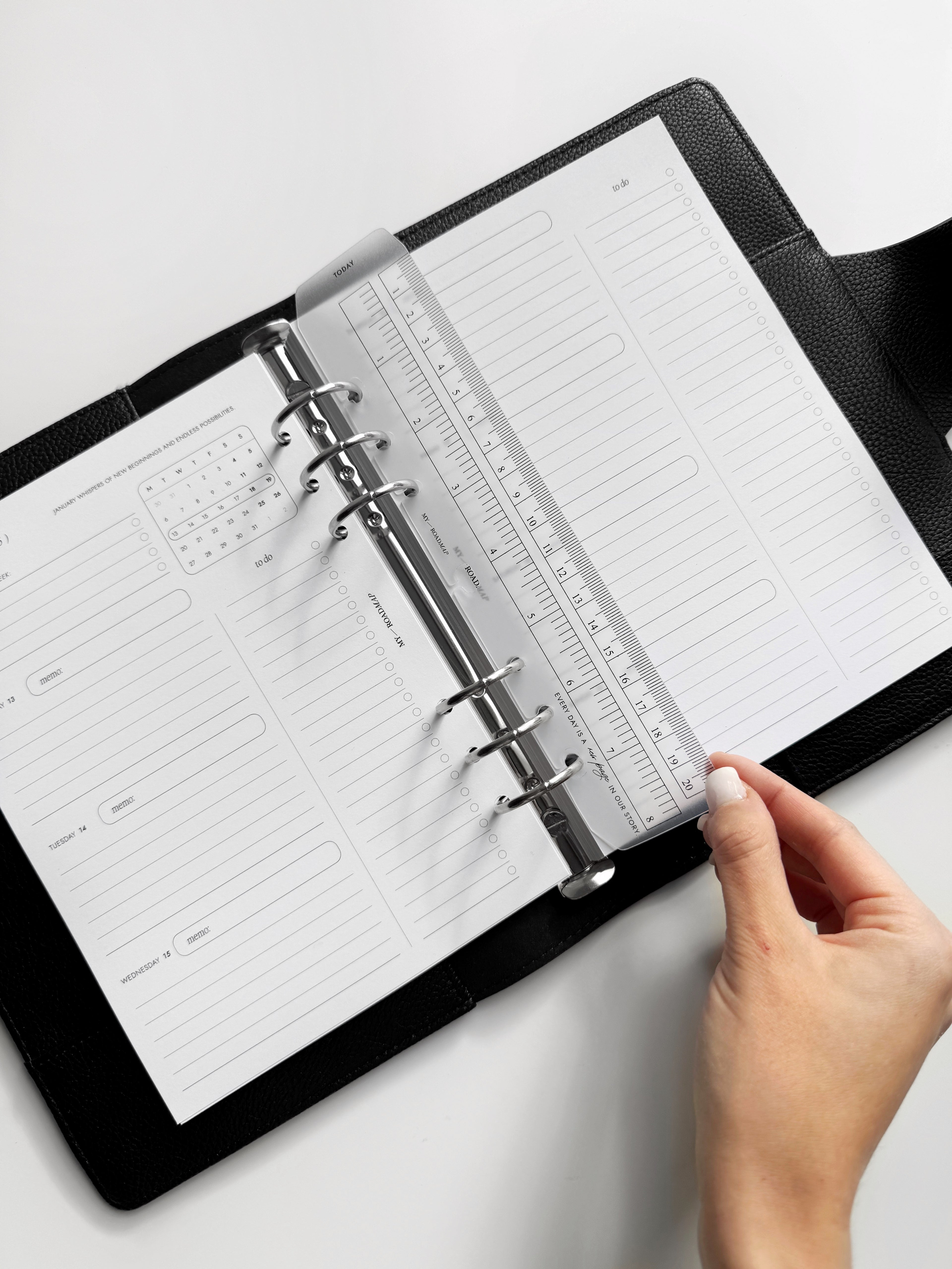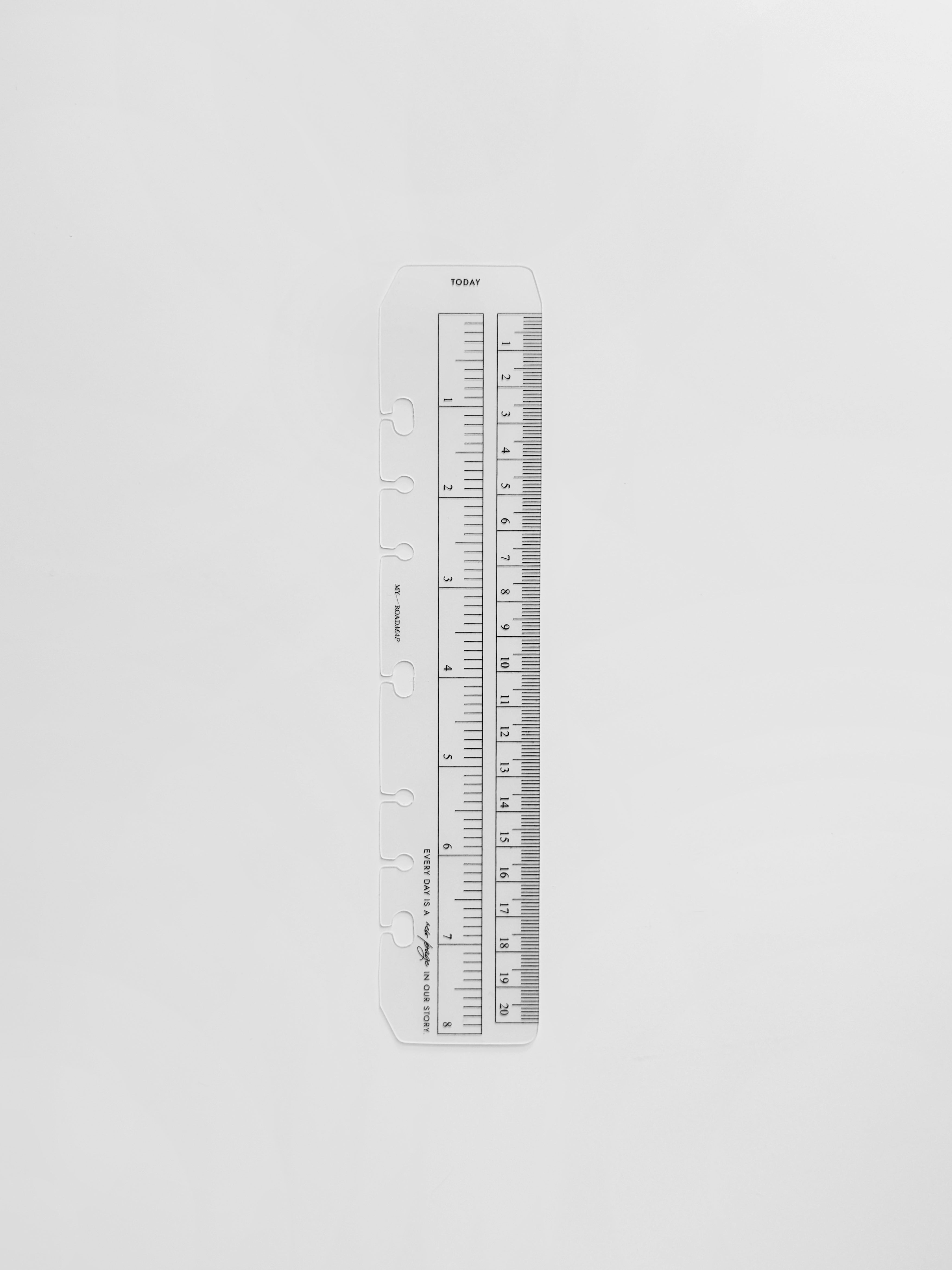 Dieses transparente Lesezeichen aus robustem Kunststoff ist perfekt für Organizer mit Ringmechanismus geeignet. Es erfüllt eine doppelte Funktion: Es dient als Messinstrument mit klaren Skalierungen in Zentimetern und Zoll und kann gleichzeitig als Lesezeichen mit der Markierung «Today» (Heute) verwendet werden, um schnell das aktuelle Datum oder wichtige Einträge zu finden. Das Lesezeichen lässt sich dank spezieller offener Löcher einfach ein- und ausheften, ohne die Ringe zu öffnen. Das elegante, minimalistische Design und die kompakte Größe machen es zu einem stilvollen und praktischen Accessoire, das perfekt zu Formaten wie A5 und Personal passt.