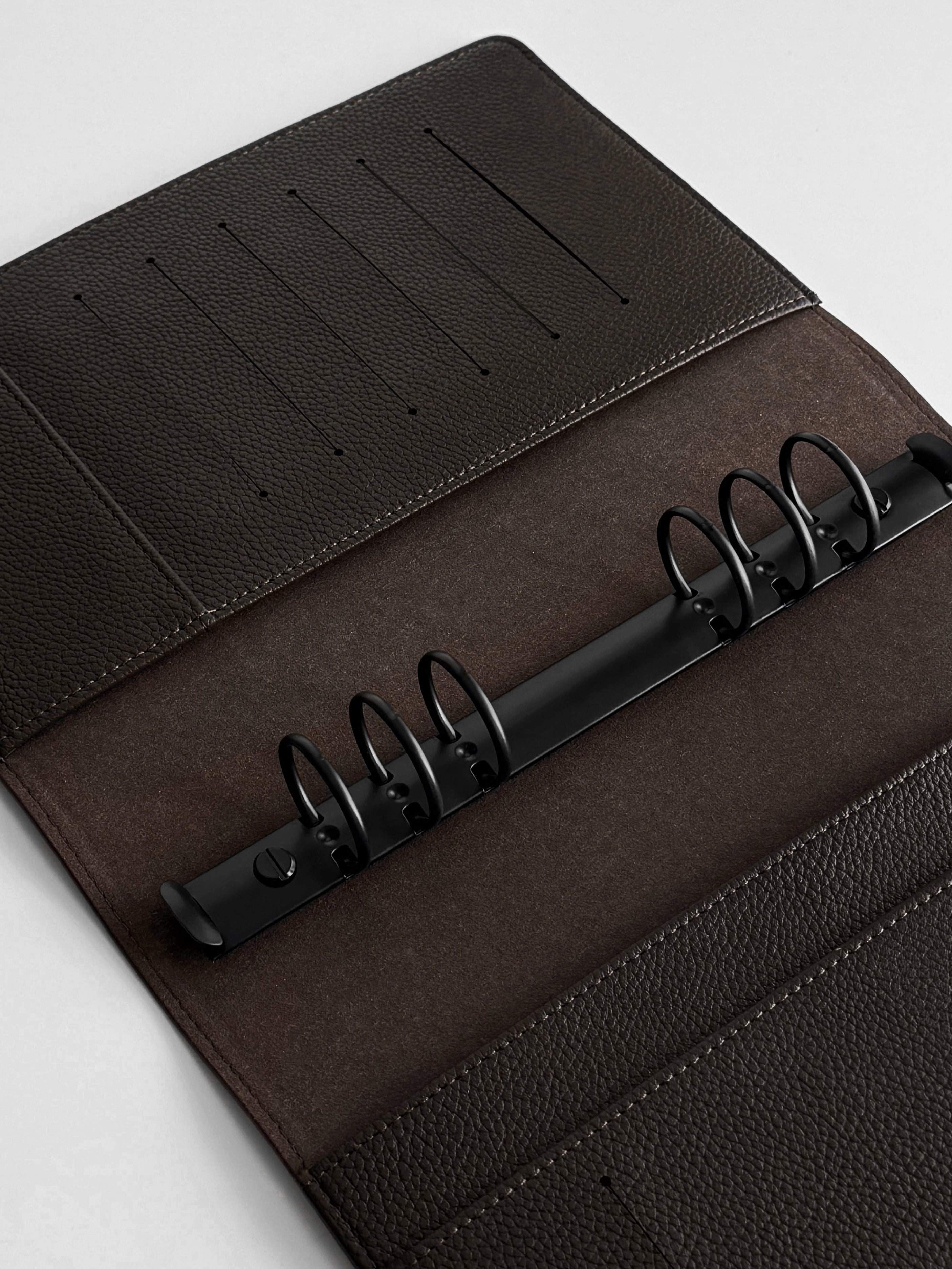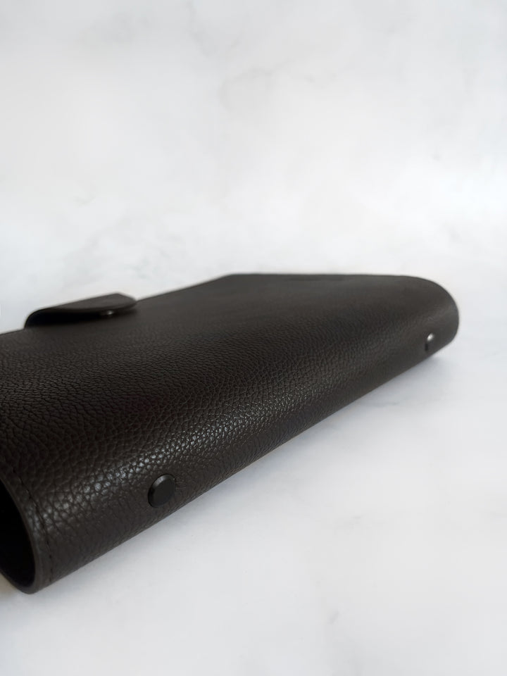 Entdecken Sie unseren exquisiten A5-Ordner aus hochwertigem veganem Leder in der Farbe „Dark Chocolate“, der aus einer eleganten Litchi-/Pebbled-Oberflächenstruktur besteht. Dieser Ordner ist die ideale Ergänzung für Ihre individuelle Organisation und verleiht Ihnen einen Hauch von Luxus. Abmessungen 250 x 190 x 40 mm.