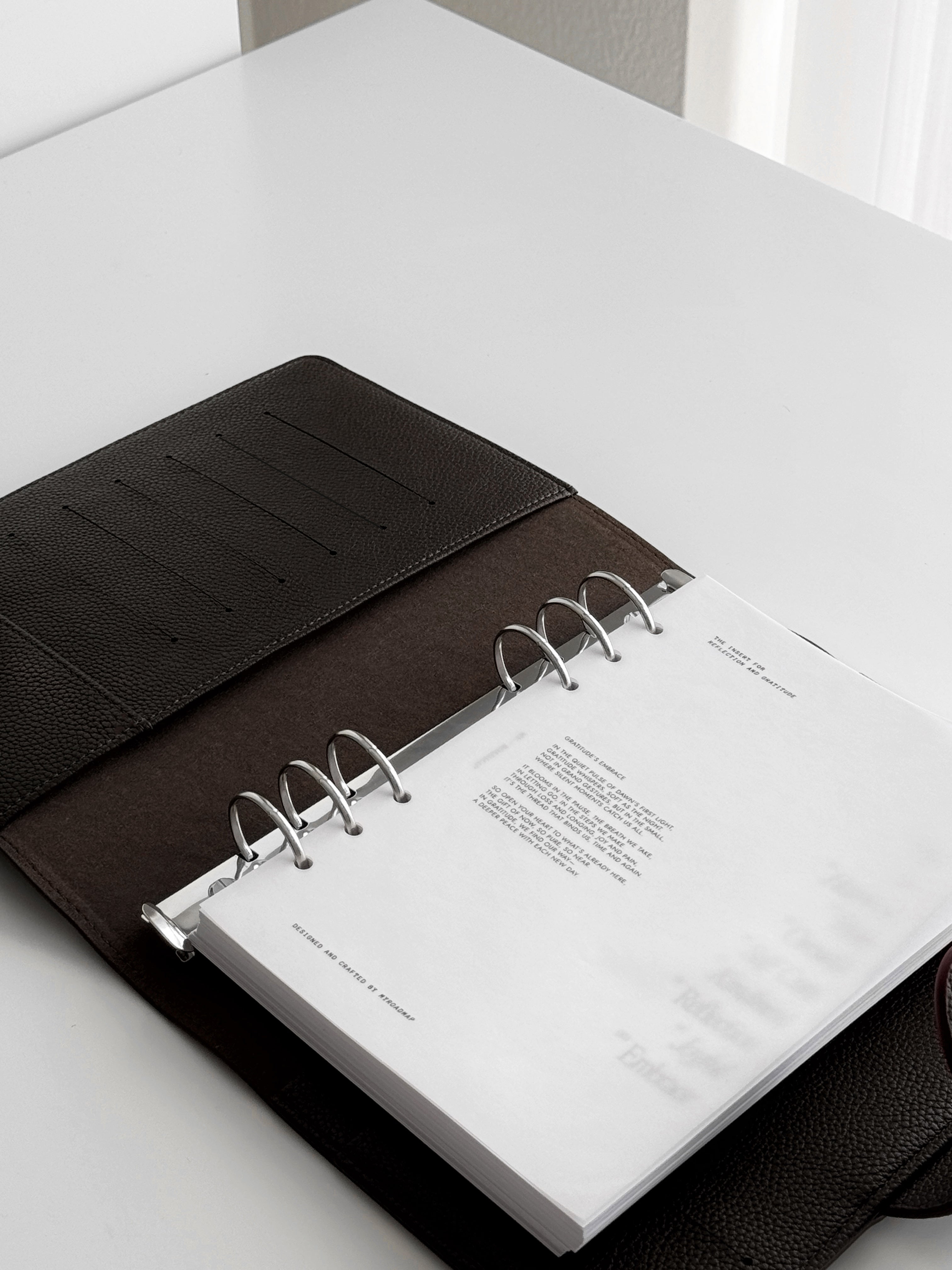 2. Mit Schwarz oder Silberringen - Der ultimative Ringplaner : Unsere zweite Variante bietet die Wahl zwischen schwarzen oder silbernen Ringen und verwandelt das Cover in einen hochfunktionalen A5 Ringplaner. Diese Option ist perfekt für diejenigen, die Wert auf strukturierte Planung und Organisation legen und dabei dennoch elegant auftreten möchten. (Ringabstände: 19-19-70-19-19mm, Ø30mm)