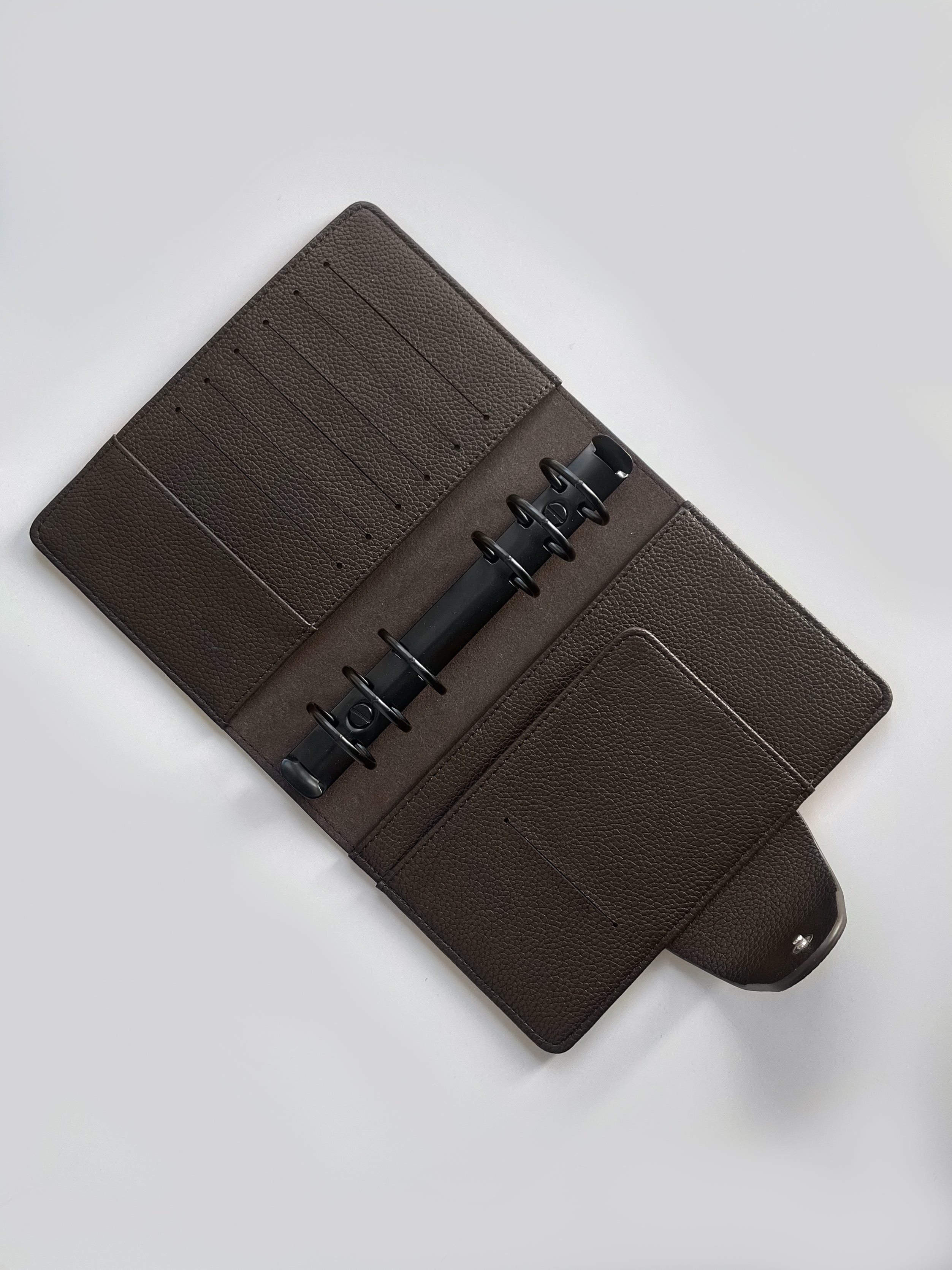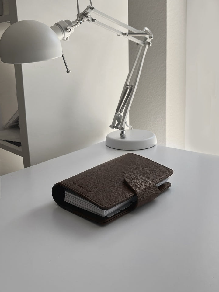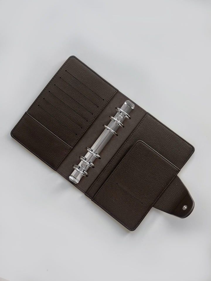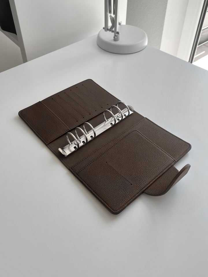 Entdecken Sie unseren exquisiten Binder in Personal-Größe aus hochwertigem veganem Leder in der Farbe «Dark Chocolate», dass aus einer eleganten Litchi-/Pebbled Oberflächenstruktur besteht. Dieser Binder ist die ideale Ergänzung für Ihre individuelle Organisation und verleiht Ihnen ein Hauch von Luxus.