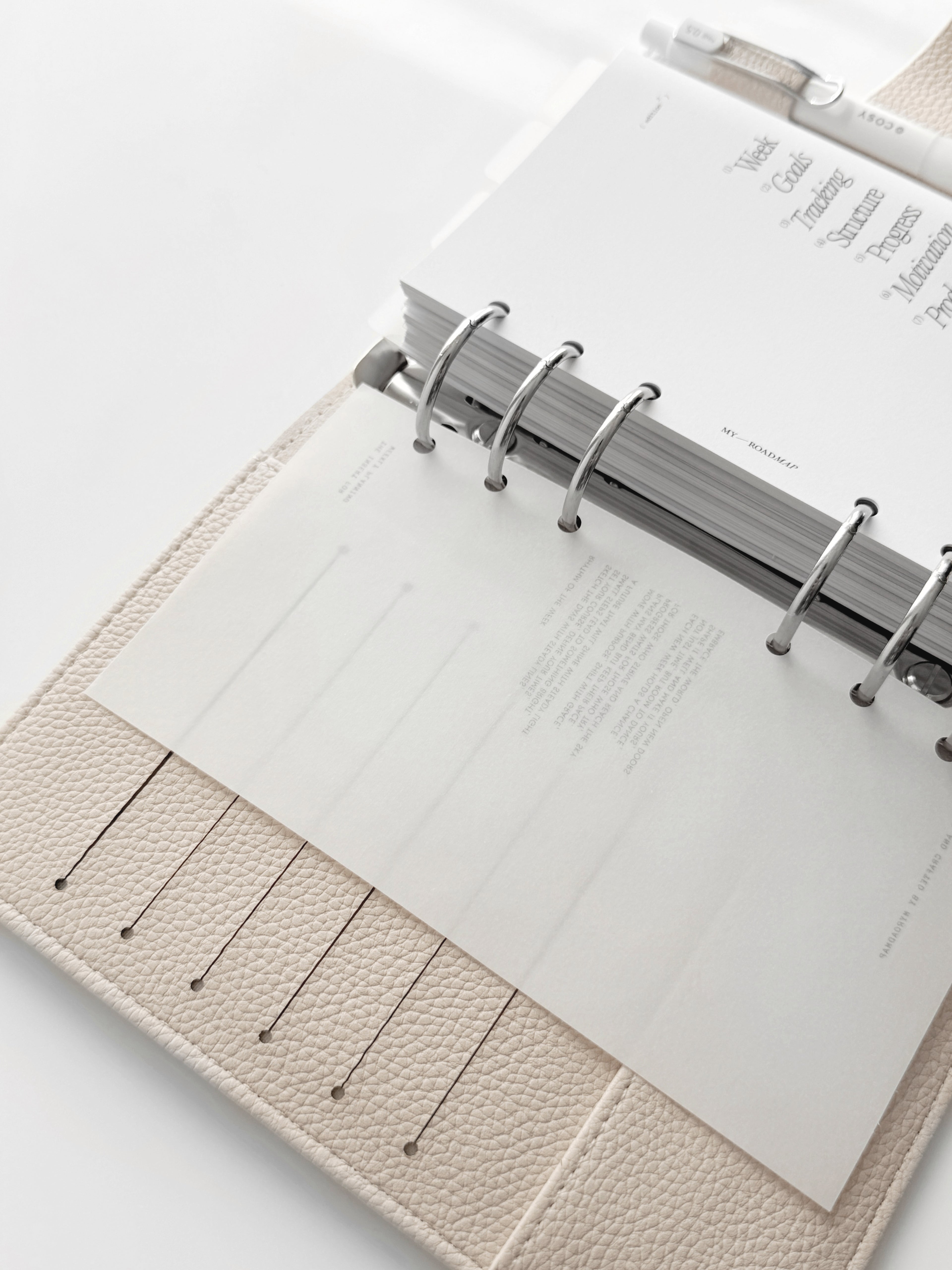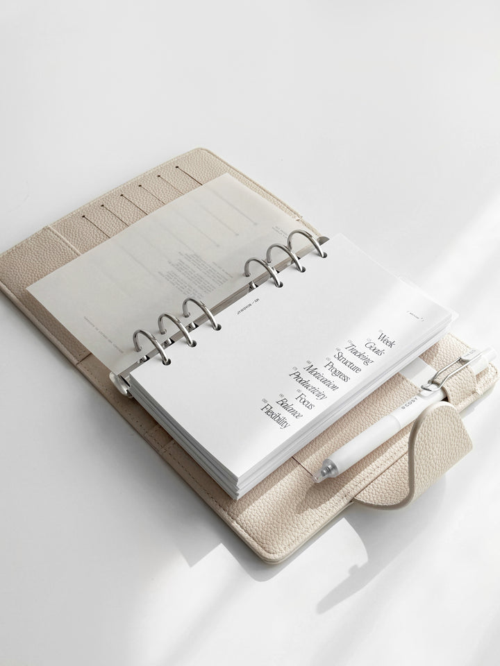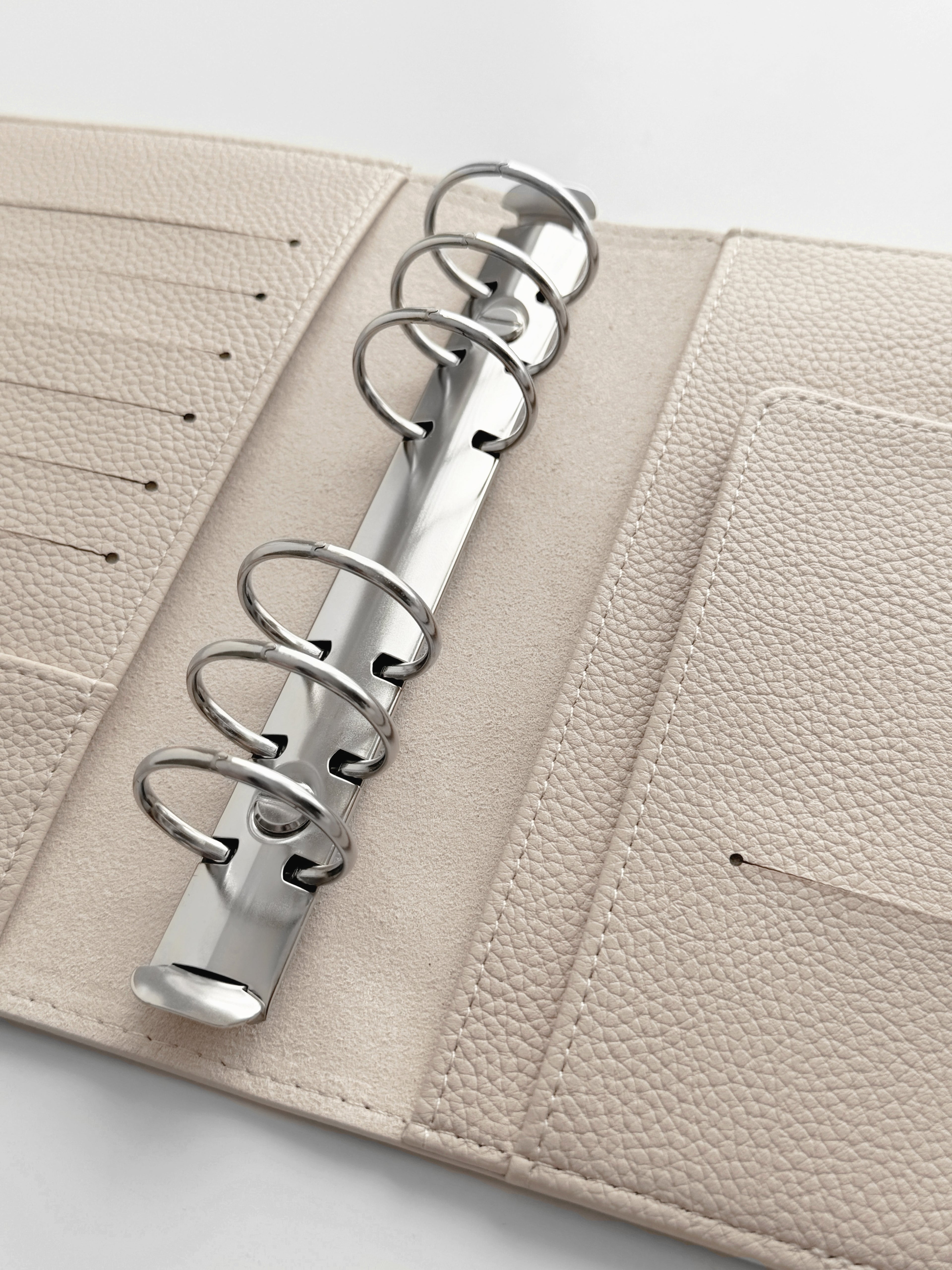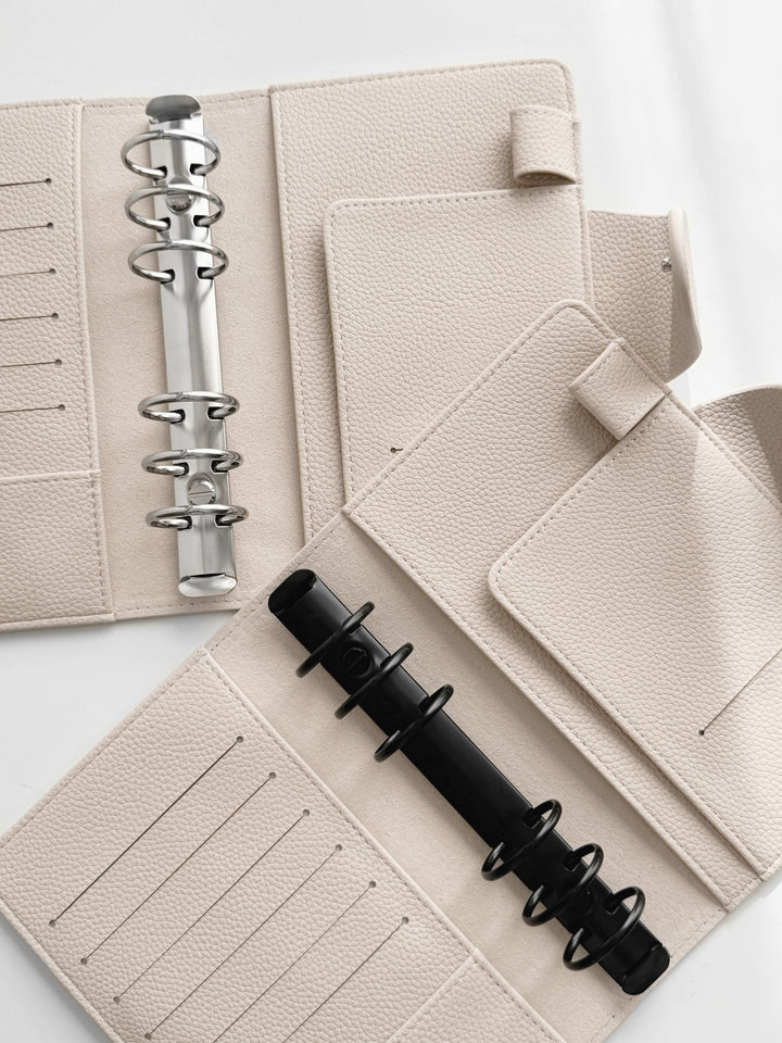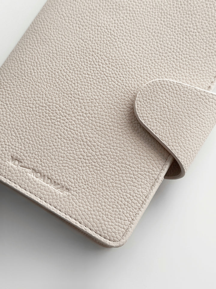 Entdecken Sie unseren exquisiten Binder in Personal-Größe aus hochwertigem veganem Leder in der Farbe «Ghost», dass aus einer eleganten Litchi-/Pebbled Oberflächenstruktur besteht. Dieser Binder ist die ideale Ergänzung für Ihre individuelle Organisation und verleiht Ihnen ein Hauch von Luxus.