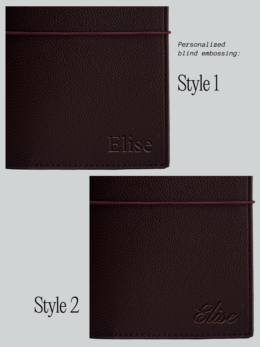 • Blindprägung: 2 Schriftarten zur Auswahl, Prägung standardmäßig außen rechts unten, (siehe Bildergalerie) max. 8 Buchstaben, andere Position ist auf Anfrage möglich