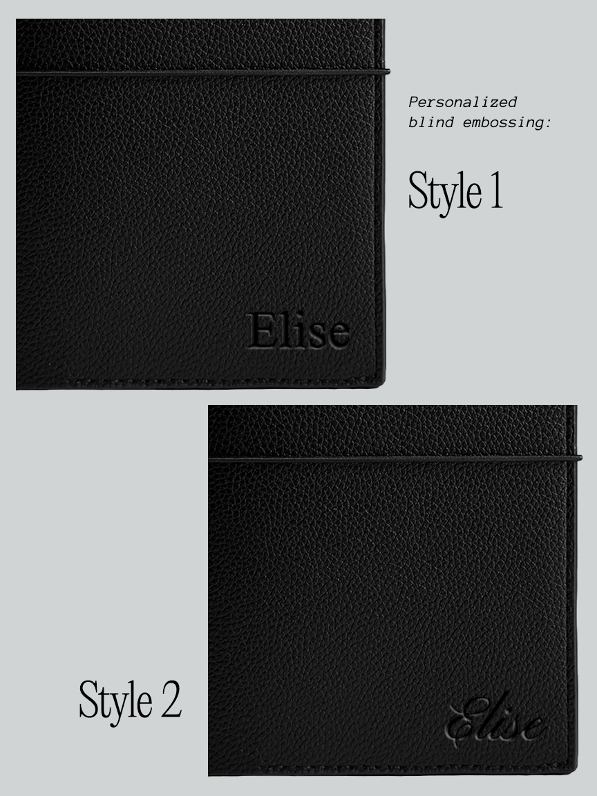 • Blindprägung: 2 Schriftarten zur Auswahl, Prägung standardmäßig außen rechts unten, (siehe Bildergalerie) max. 8 Buchstaben, andere Position ist auf Anfrage möglich