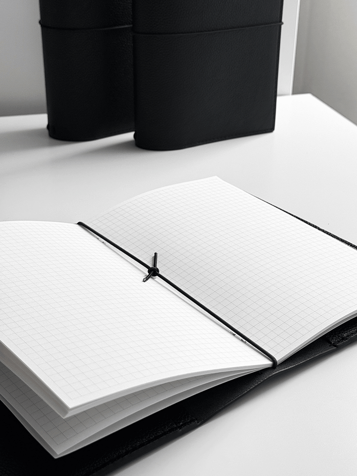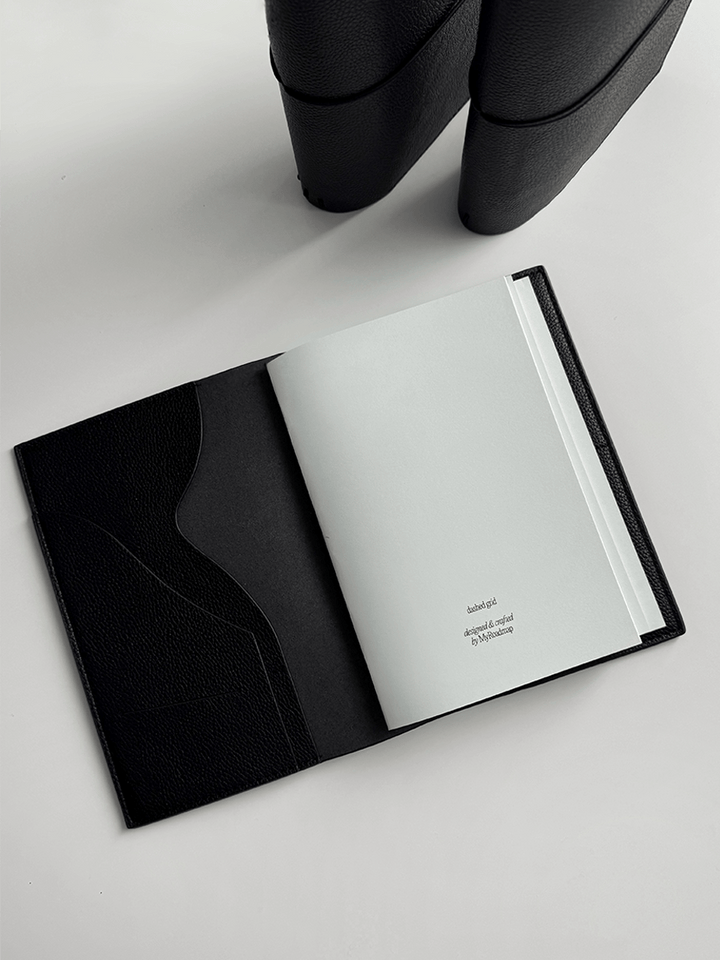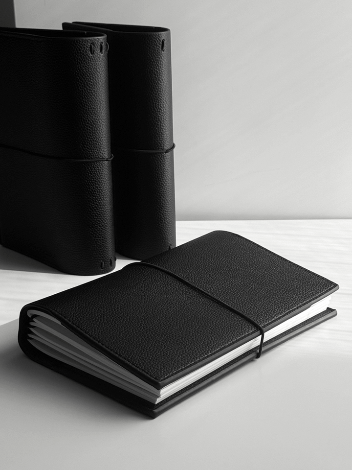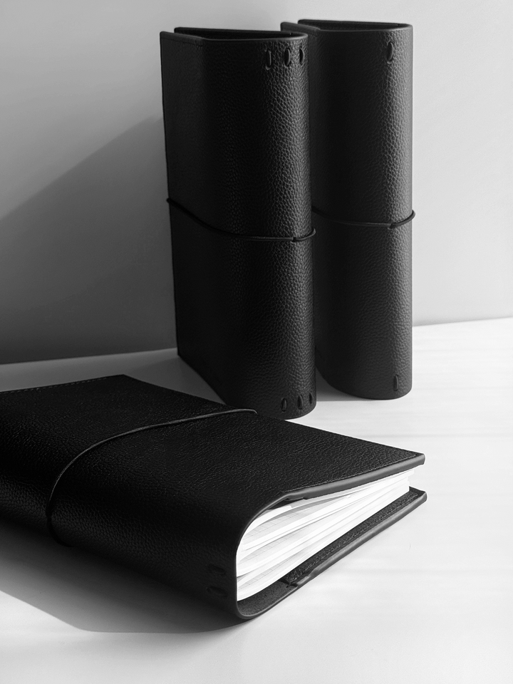 Erstelle dein persönliches Reise- oder Lebensjournal mit dem MyRoadbook Cover A5 „Midnight“, gefertigt aus hochwertigem, veganem Leder mit einer eleganten Litchi-/Pebbled-Oberflächenstruktur.