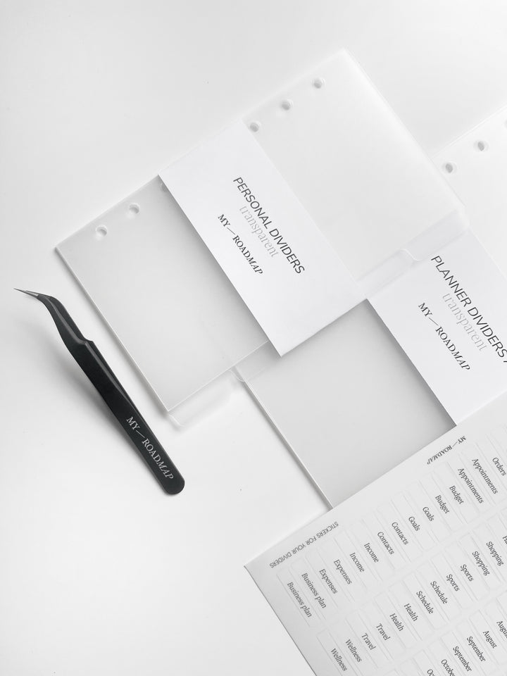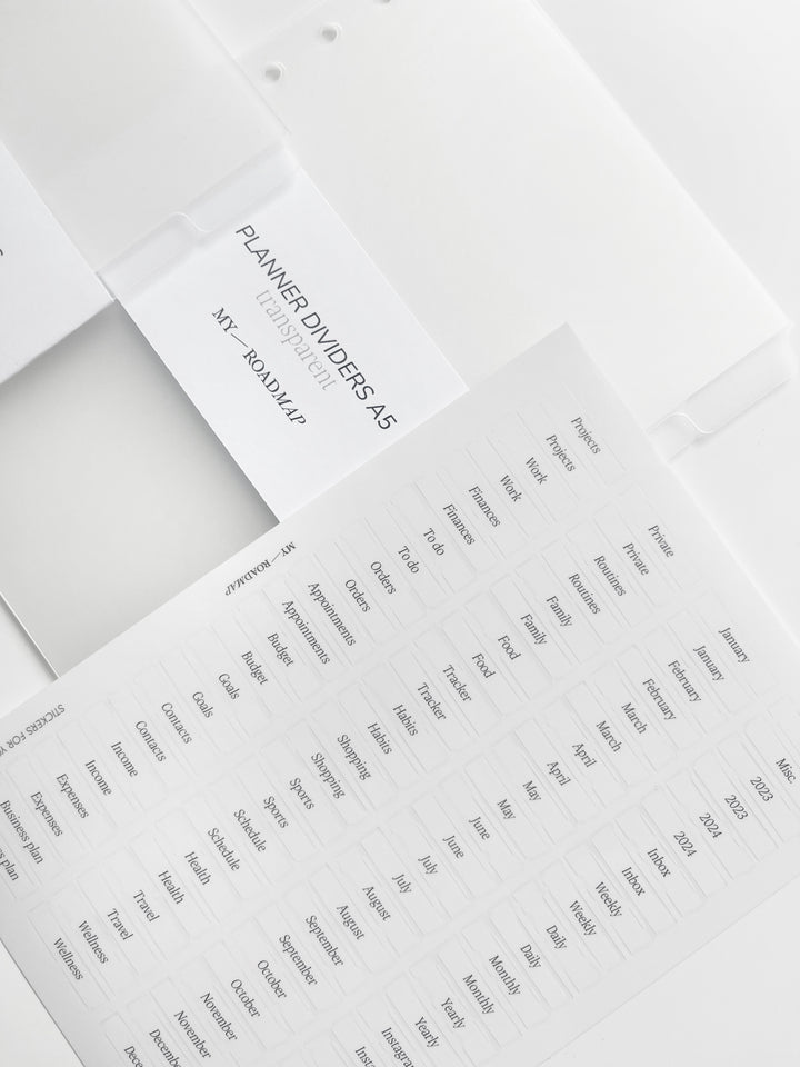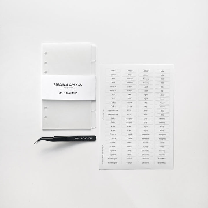 Register A5/Personal frosted+Stickers transparent (schwarz Druck)+Pinzette