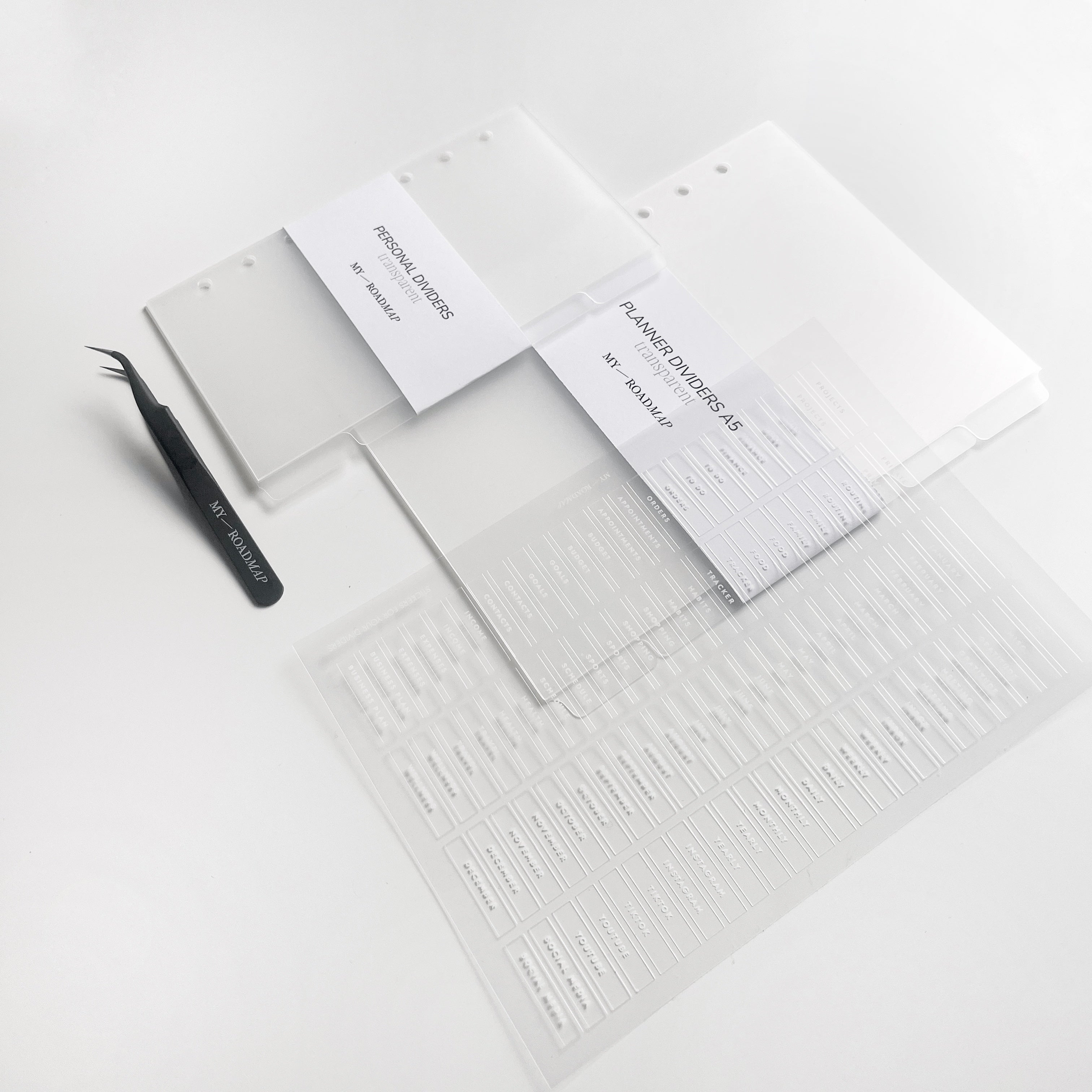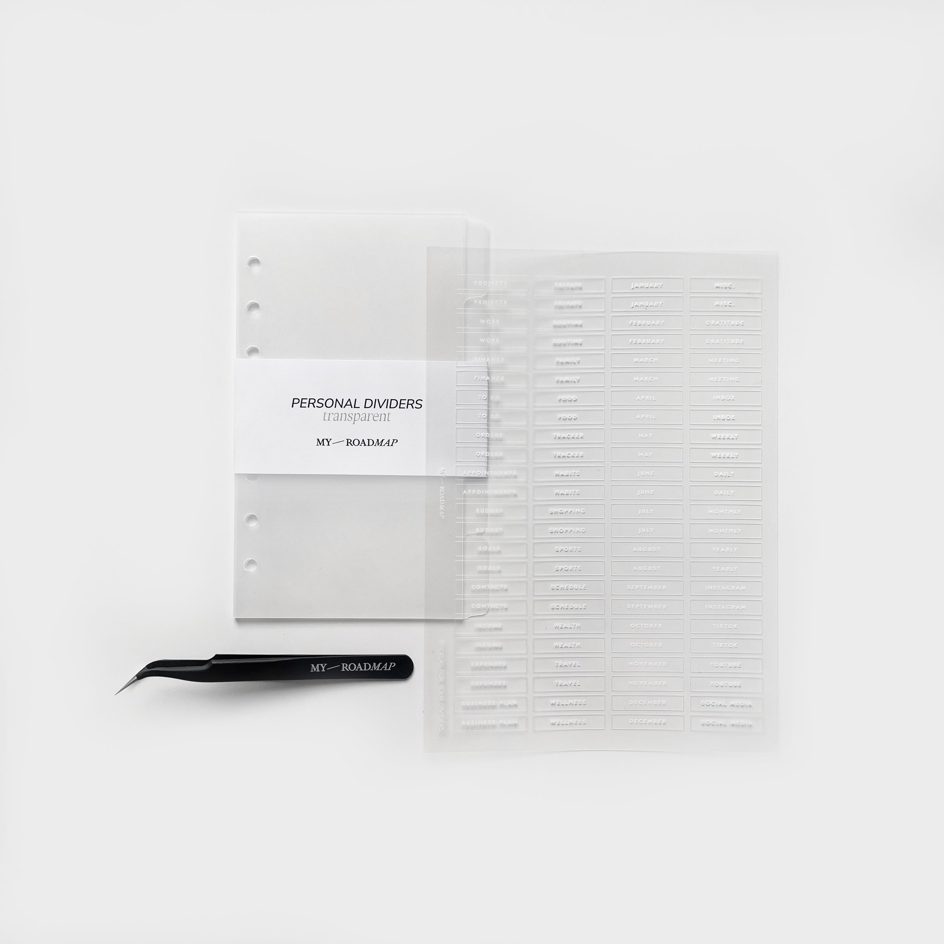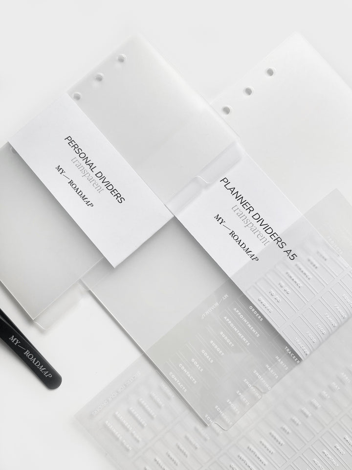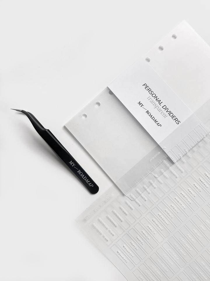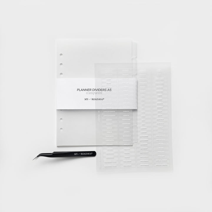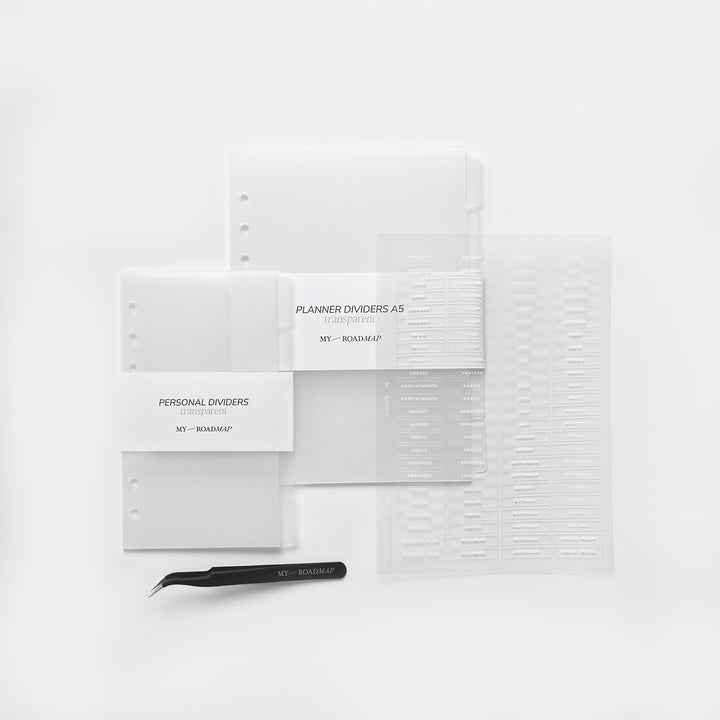 Register A5/Personal frosted+Stickers transparent (weiß Druck)+Pinzette
