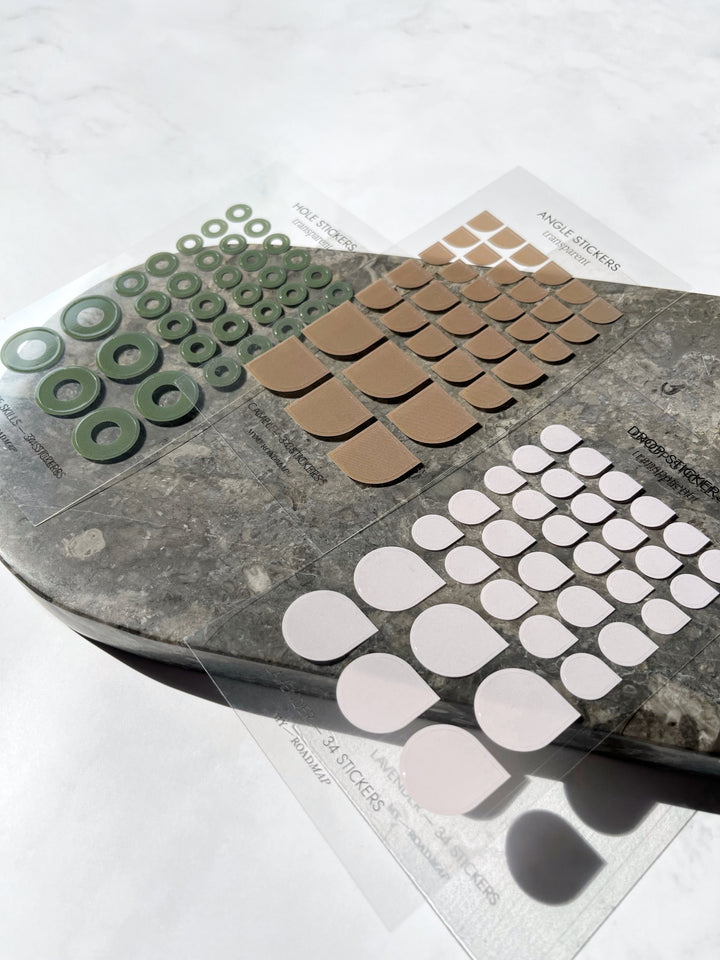 Verwenden Sie diese moderne Stickers in drei verschiedenen Formen und Farben (HOLE, ANGLE, DROP), um wichtige Ereignisse in Ihrem Planer, Bullet Journal, Notebook usw. zu markieren. Gedruckt sind diese Stickers auf klarer transparenter Folie. Auf jedem Bogen gibt es drei Größen, um die relevanten Ereignisse zu unterscheiden. Hier ist der Kreativität keine Grenzen gesetzt...