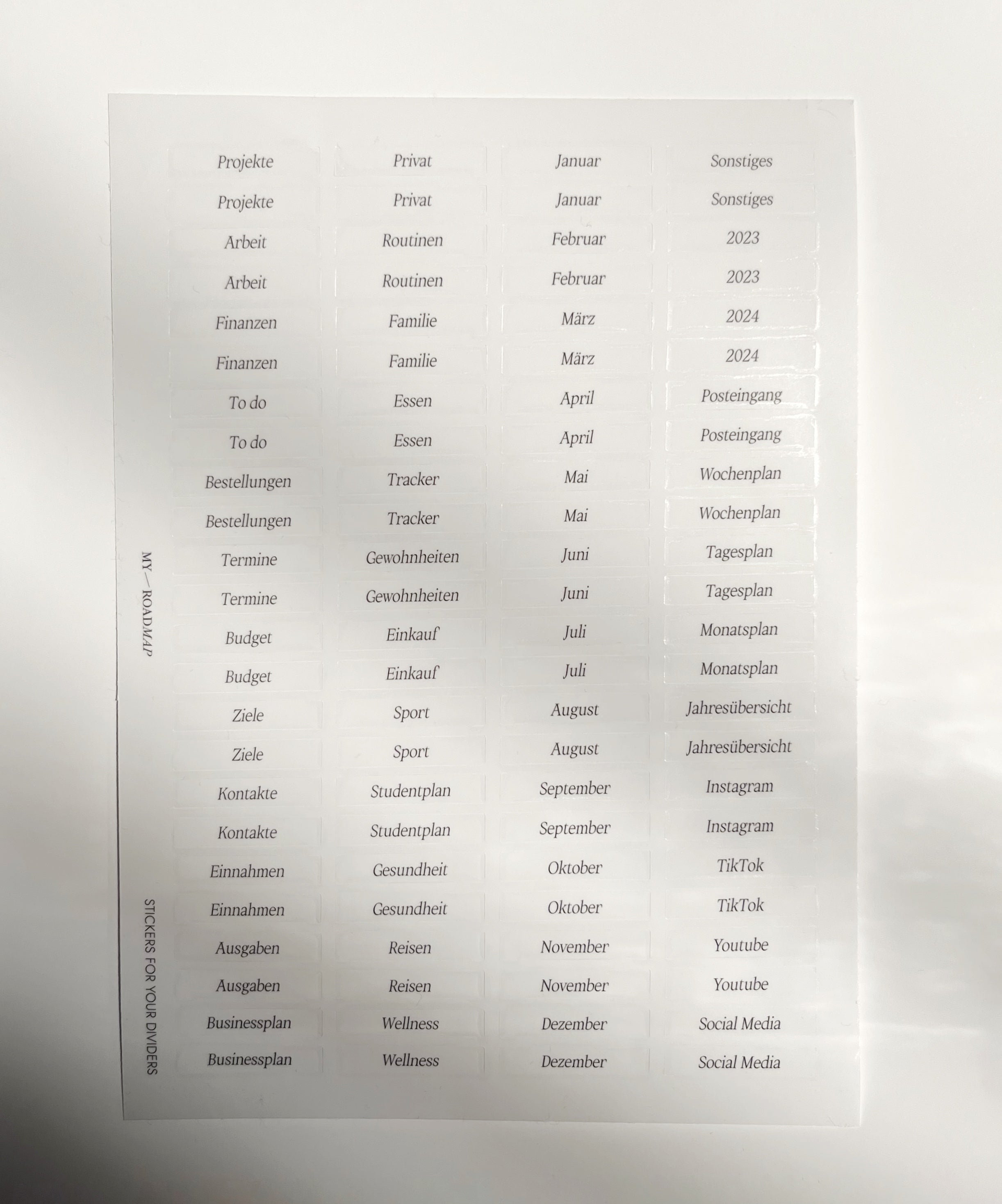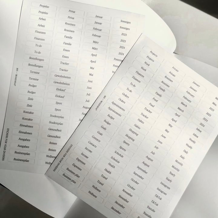 Diese transparente Stickers mit schwarzem Aufdruck, eignen sich sowohl für transparente als auch für alle helle Materialien und Farben. Sie können für Seitenmarkierer jeglicher Art verwendet werden.